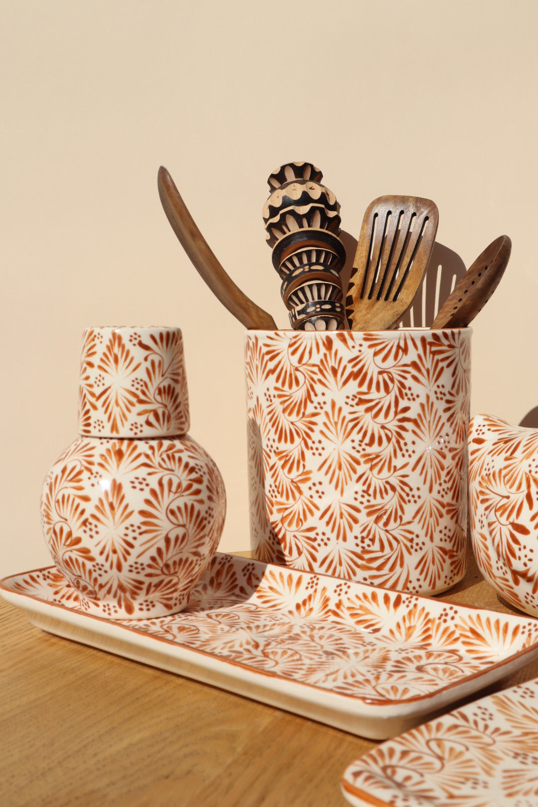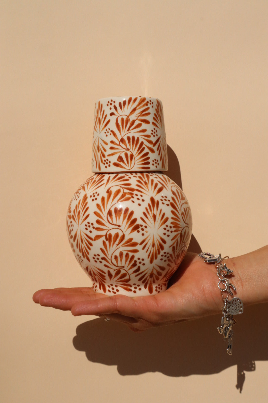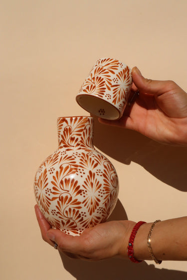 Hand-painted by artisans in Guanajuato, Mexico, this piece features our exclusive "Tierra Cálida" colorway—a stunning combination of rich, warm rust and creamy white. The intricate, delicate floral and leaf patterns evoke the beauty of fine traditional ceramics and the comforting warmth of the earth.