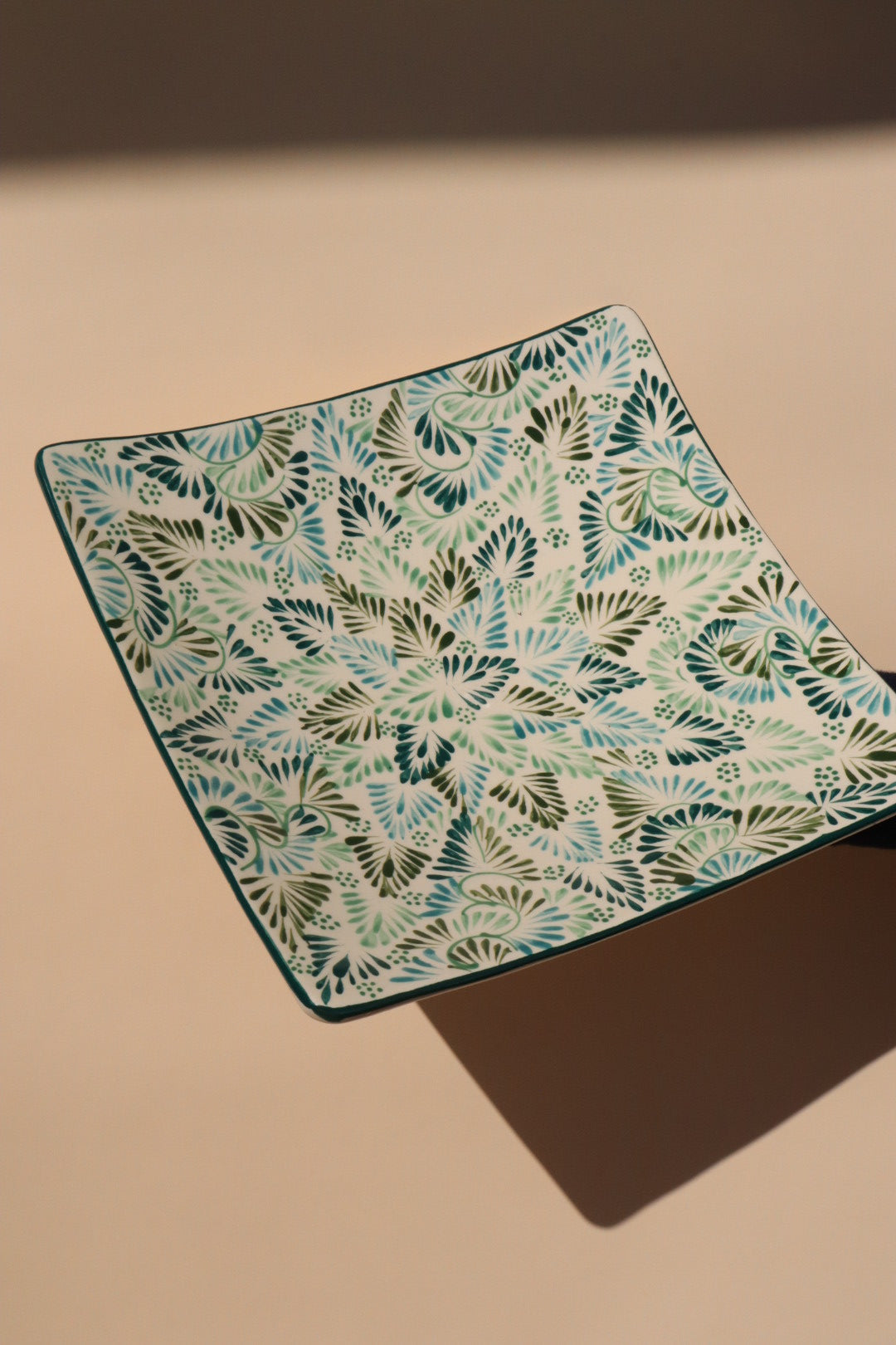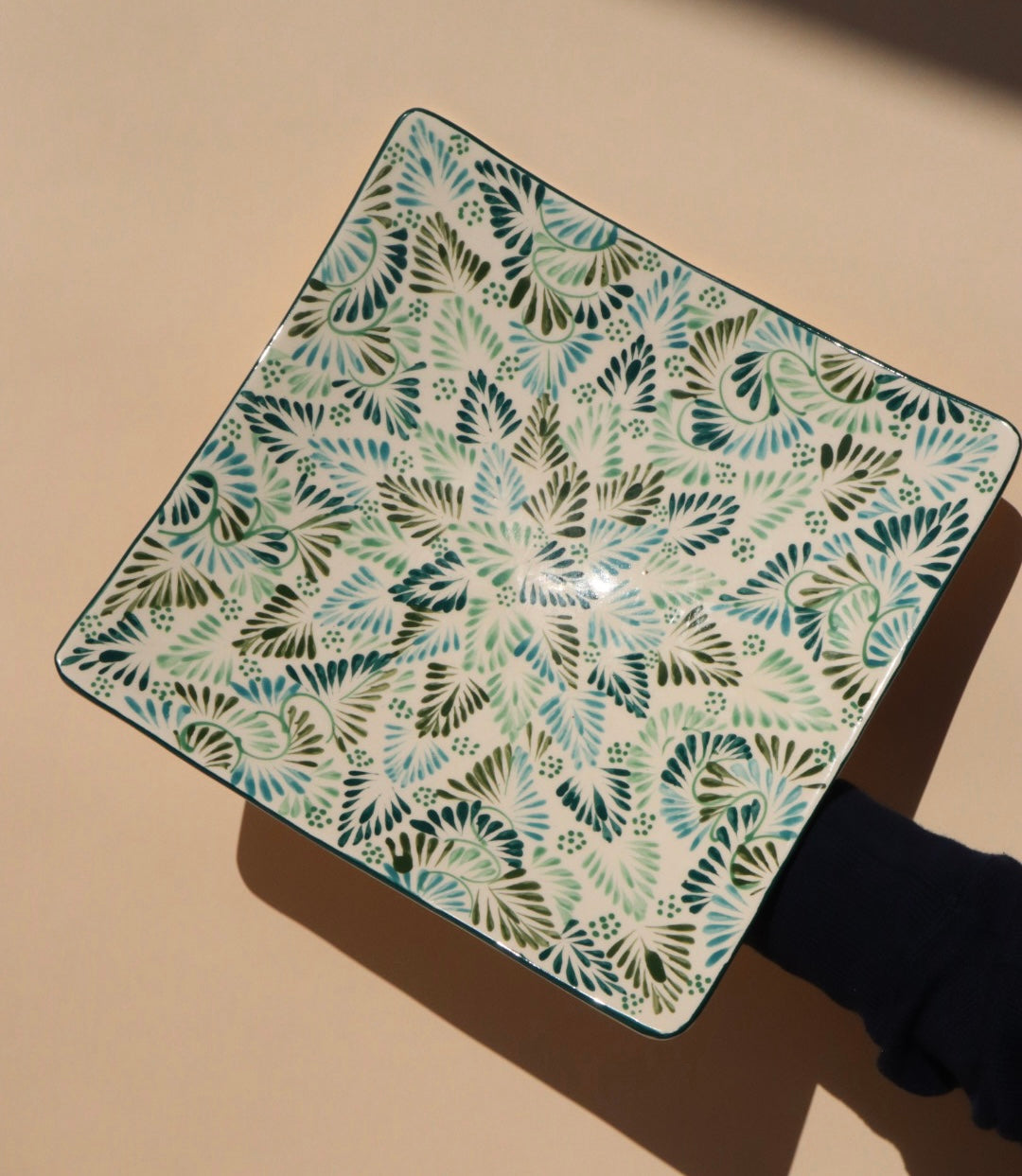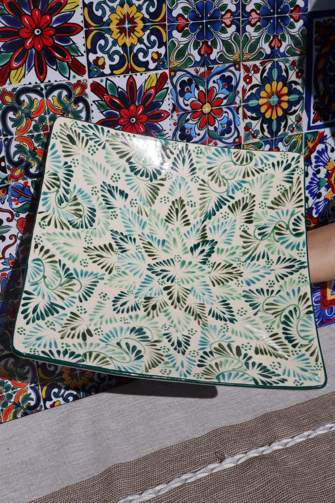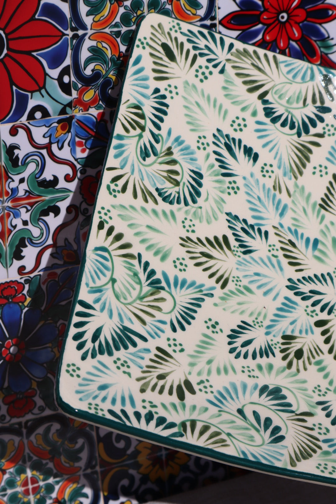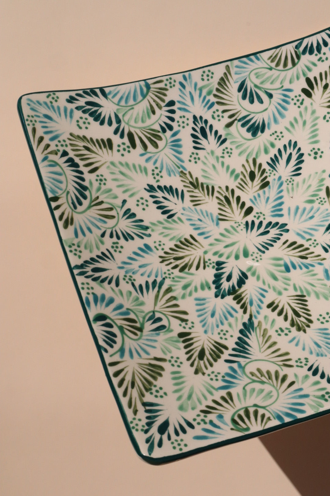 This tray features our exclusive "Verde Tranquilo" colorwayโ€”a serene and refreshing blend of multiple shades of blue and green, set against a creamy white background. The intricate, delicate leaf-and-vine patterns evoke a sense of natural tranquility and subtle elegance, making this a unique statement piece.