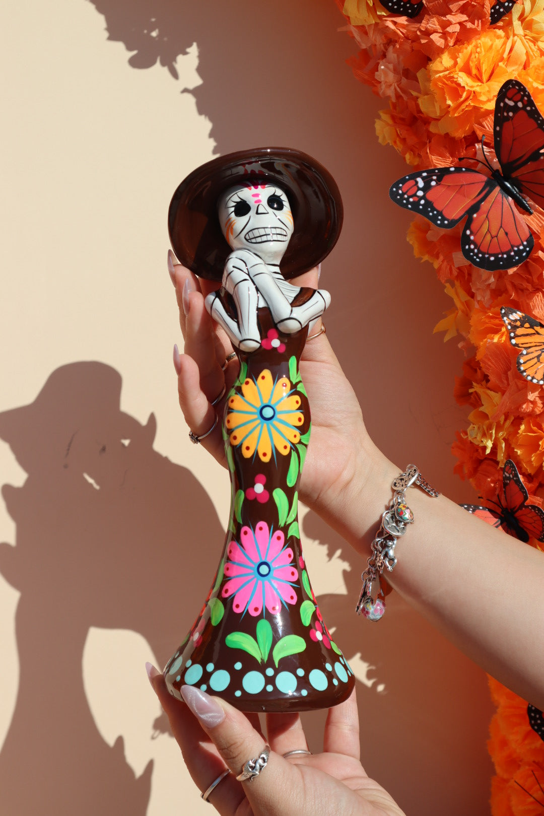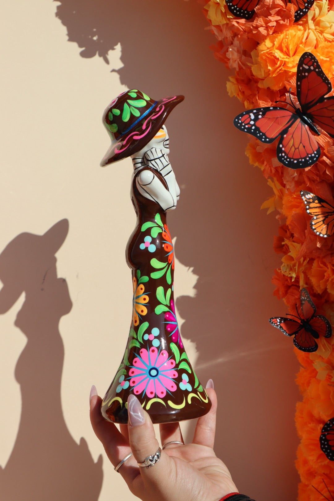 Embrace the rich heritage of Mexico with this stunning, hand-painted Brown Clay Catrina Figurine. A perfect centerpiece for your ofrenda (altar) or a captivating addition to your year-round home décor, this piece embodies the elegance and joyful remembrance central to the Día de Muertos celebration.