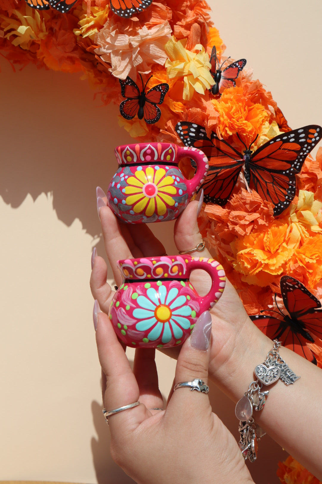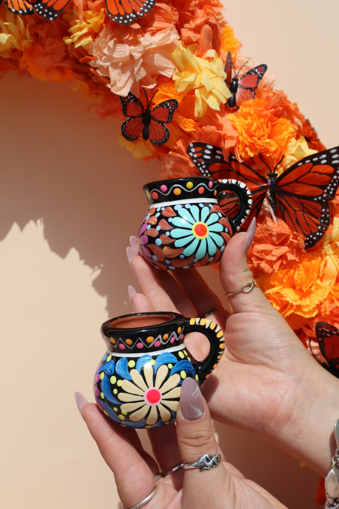 Indulge in the beauty of our handcrafted clay candles. Each shot glass features the stunning base color of your choice, while the painted designs are a delightful surprise. Our talented artisans hand-paint each jarrito with a unique combination of colors and patterns, no two are exactly alike.