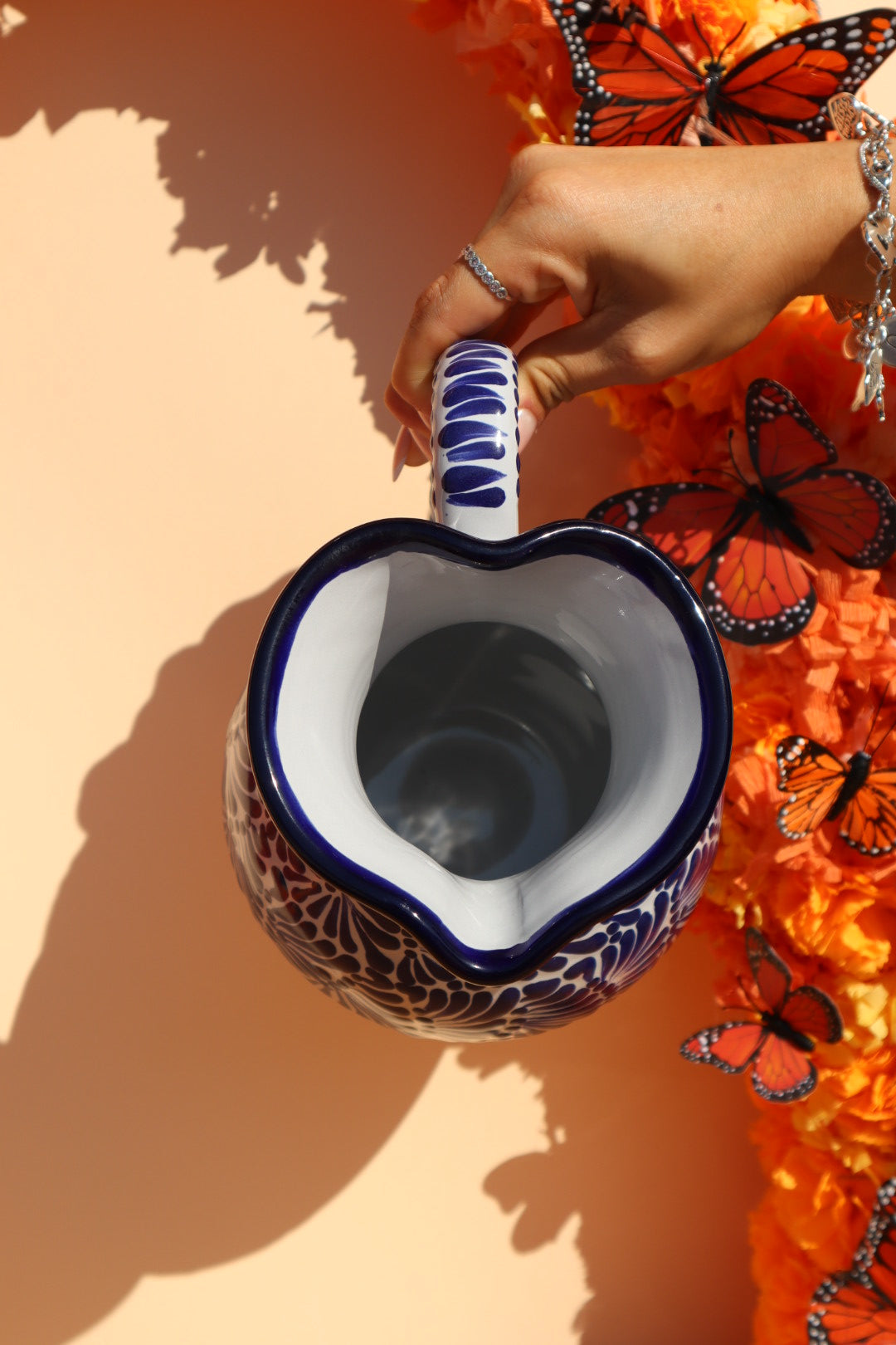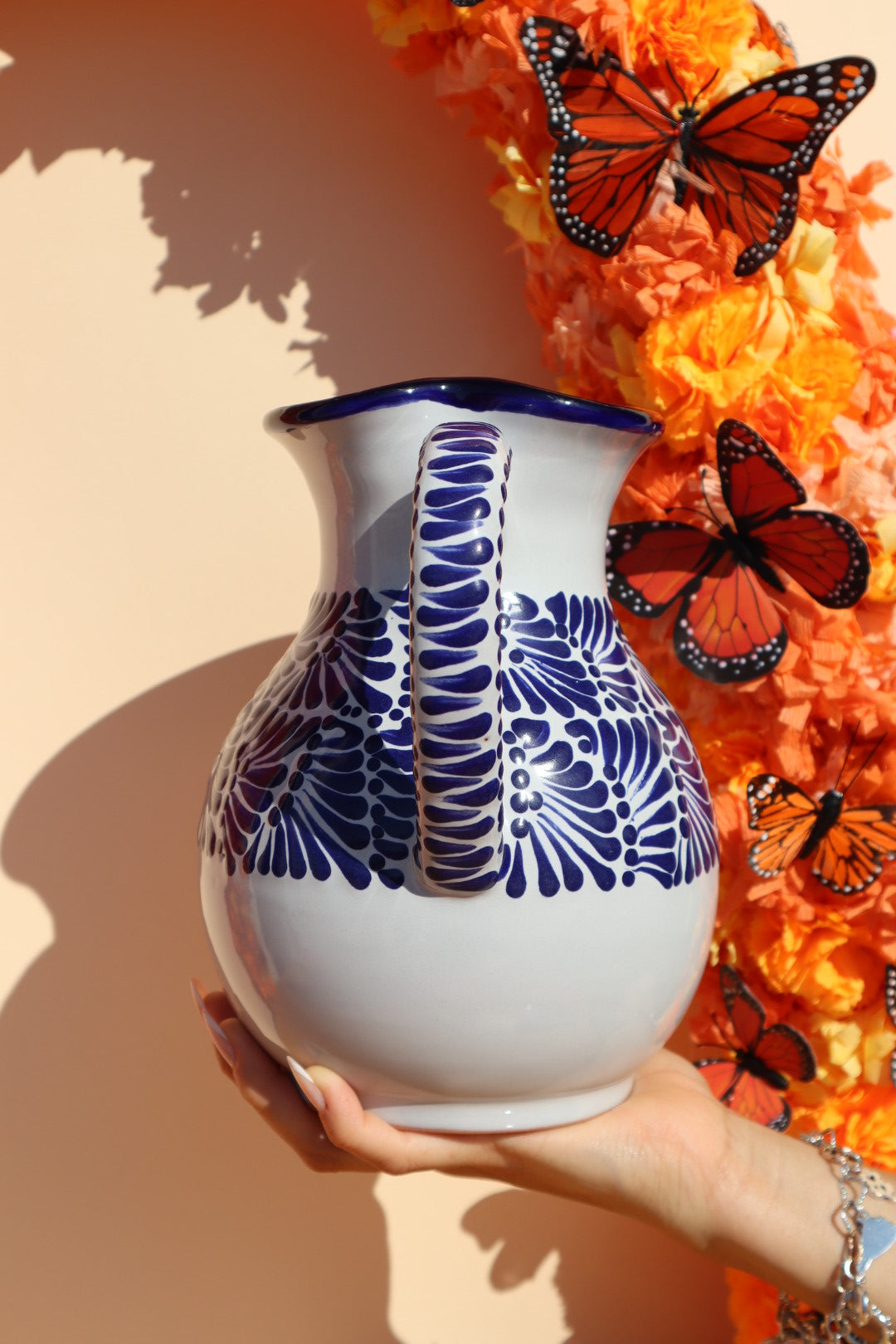This beautiful piece is made from Talavera ceramic and features a stunning, hand-painted plumeado paint strokes that covers the generous belly of the pitcher. While the core pattern is consistent, please remember that this is a hand-painted item. Slight variations in brushstrokes (plumeado), color saturation, and pattern density are natural features that guarantee your pitcher is a unique, one-of-a-kind piece of Mexican folk art.