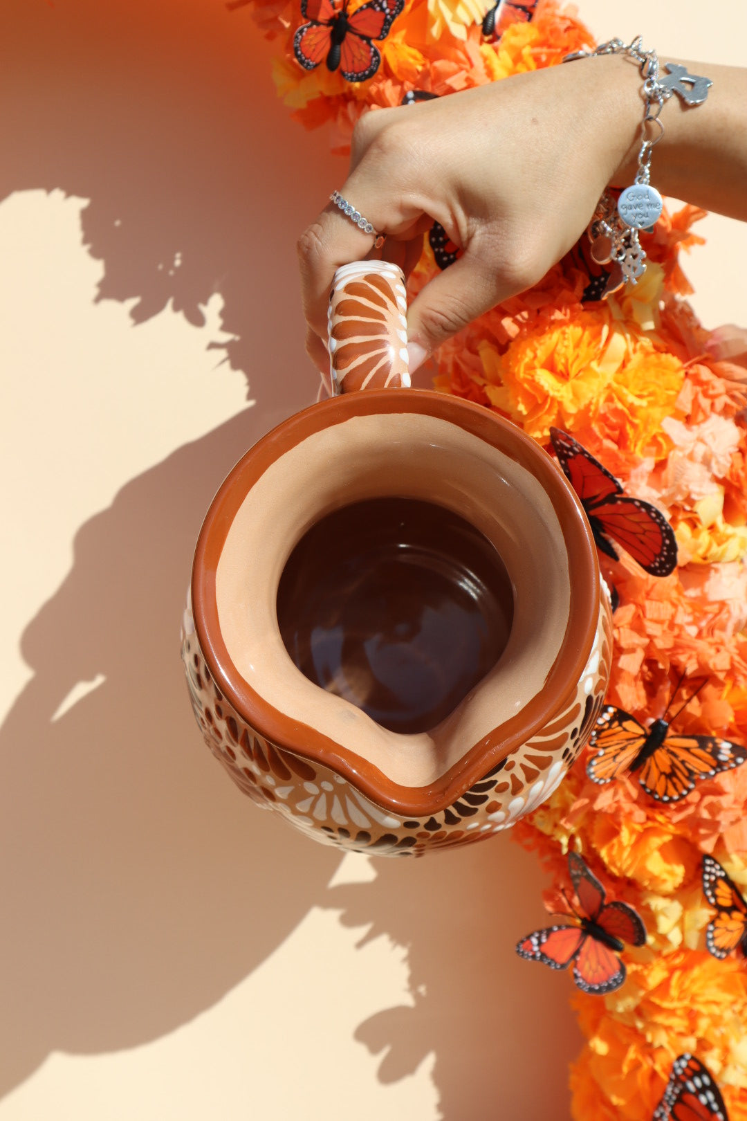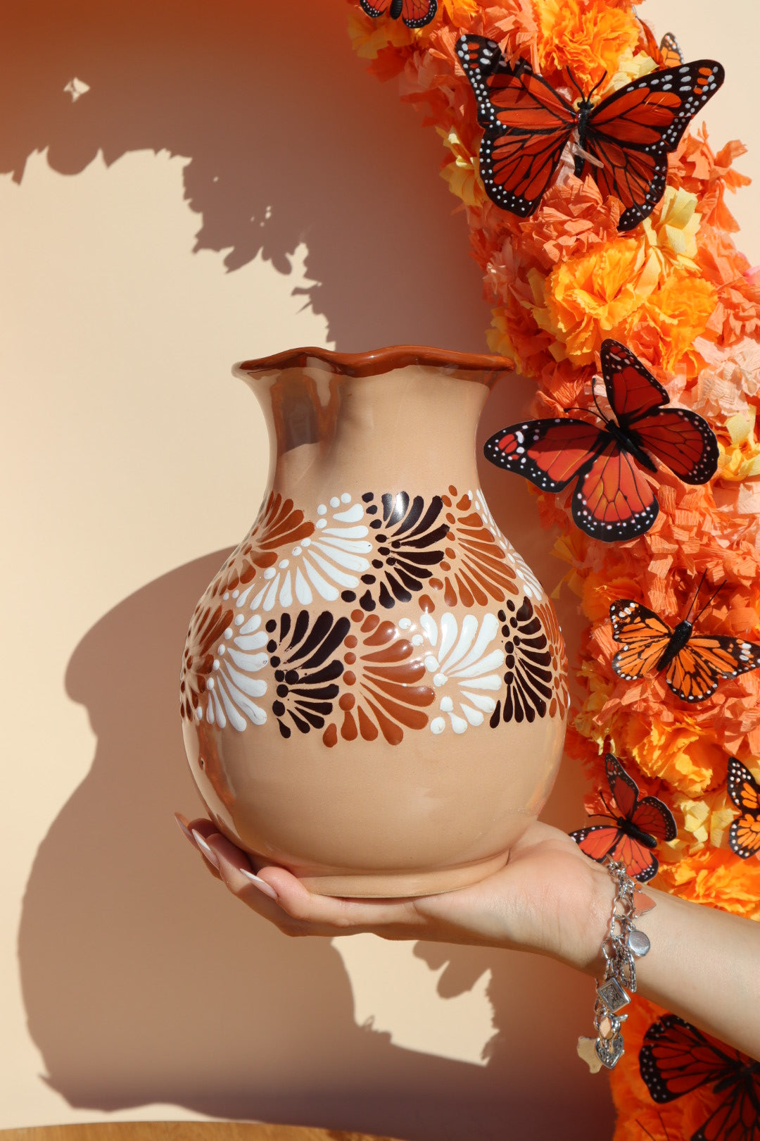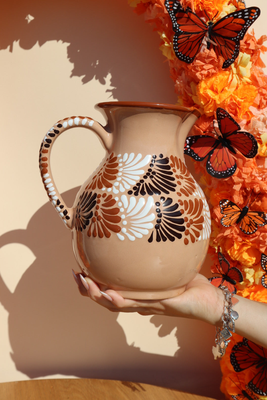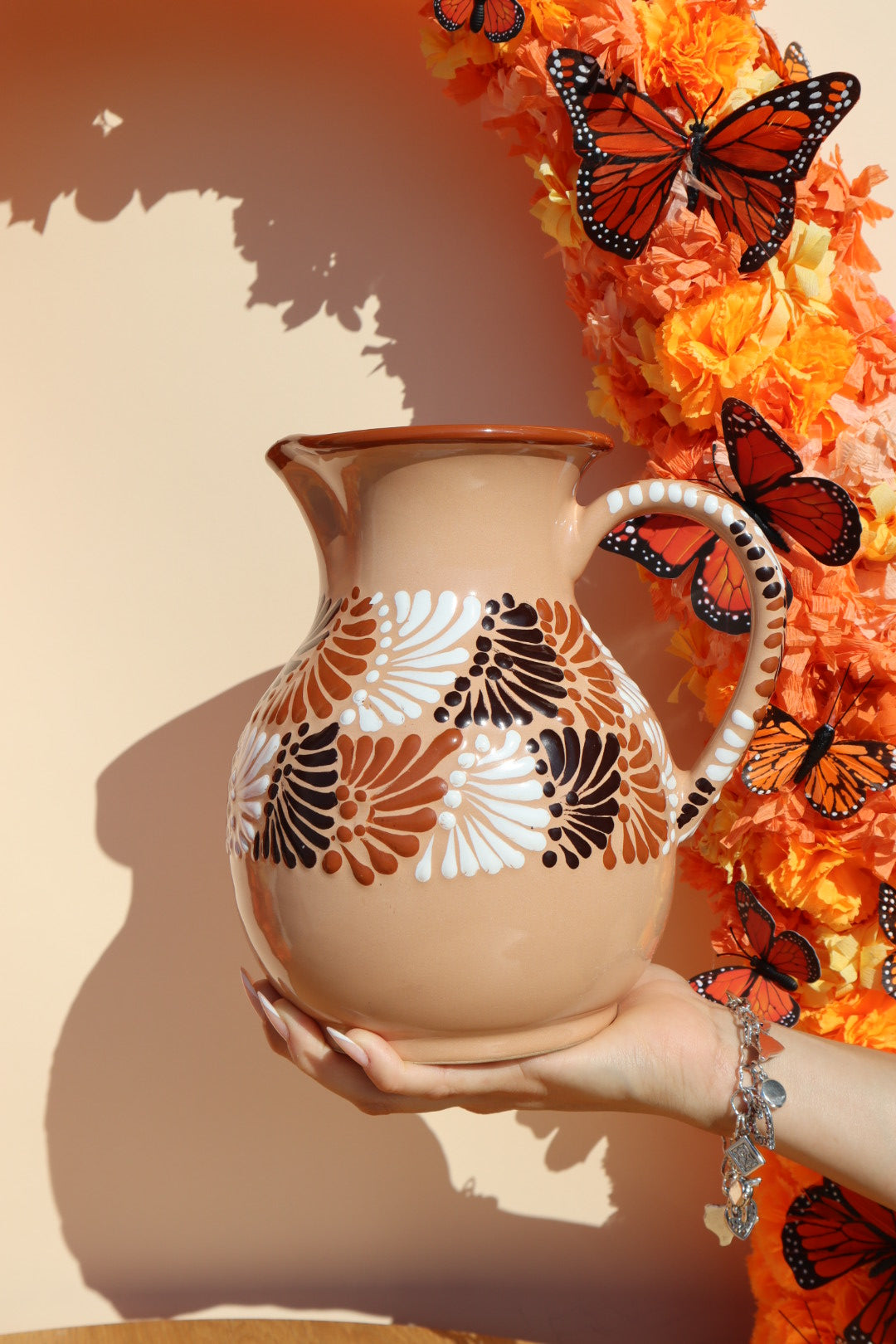 This beautiful piece is made from Talavera ceramic and features a stunning, hand-painted plumeado paint strokes that covers the generous belly of the pitcher. While the core pattern is consistent, please remember that this is a hand-painted item. Slight variations in brushstrokes (plumeado), color saturation, and pattern density are natural features that guarantee your pitcher is a unique, one-of-a-kind piece of Mexican folk art.