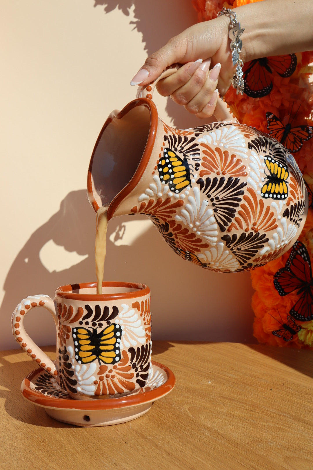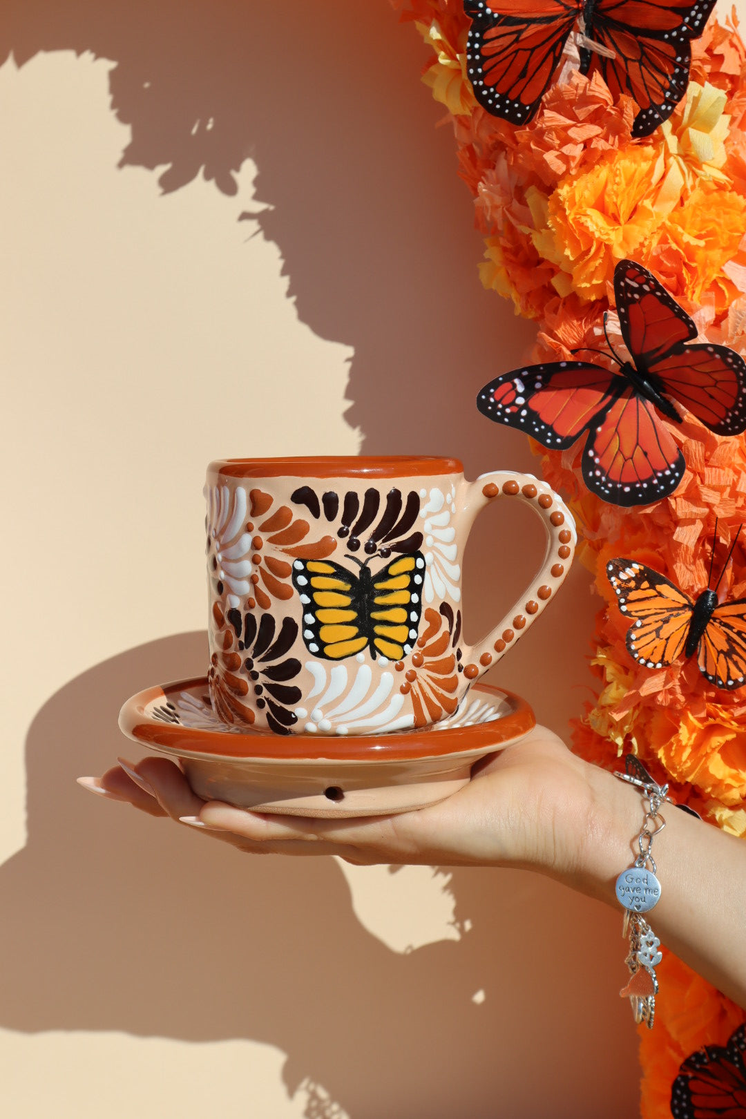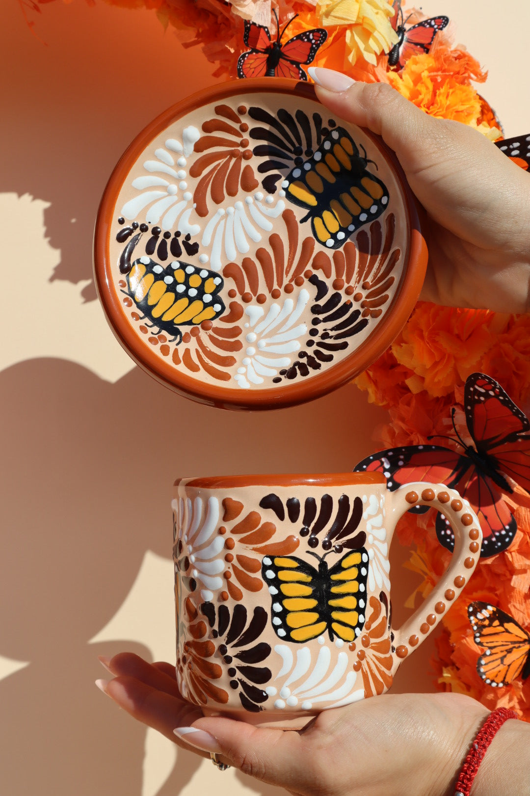 This set is crafted from genuine Talavera ceramic, known for its vibrant colors and durable glaze. Each piece features a gorgeous hand-painted design that includes the symbolic Monarch butterfly surrounded by rich, stylized floral or fan motifs. The set includes a mug and a matching saucer, perfect for catching drips or serving a small pastry.