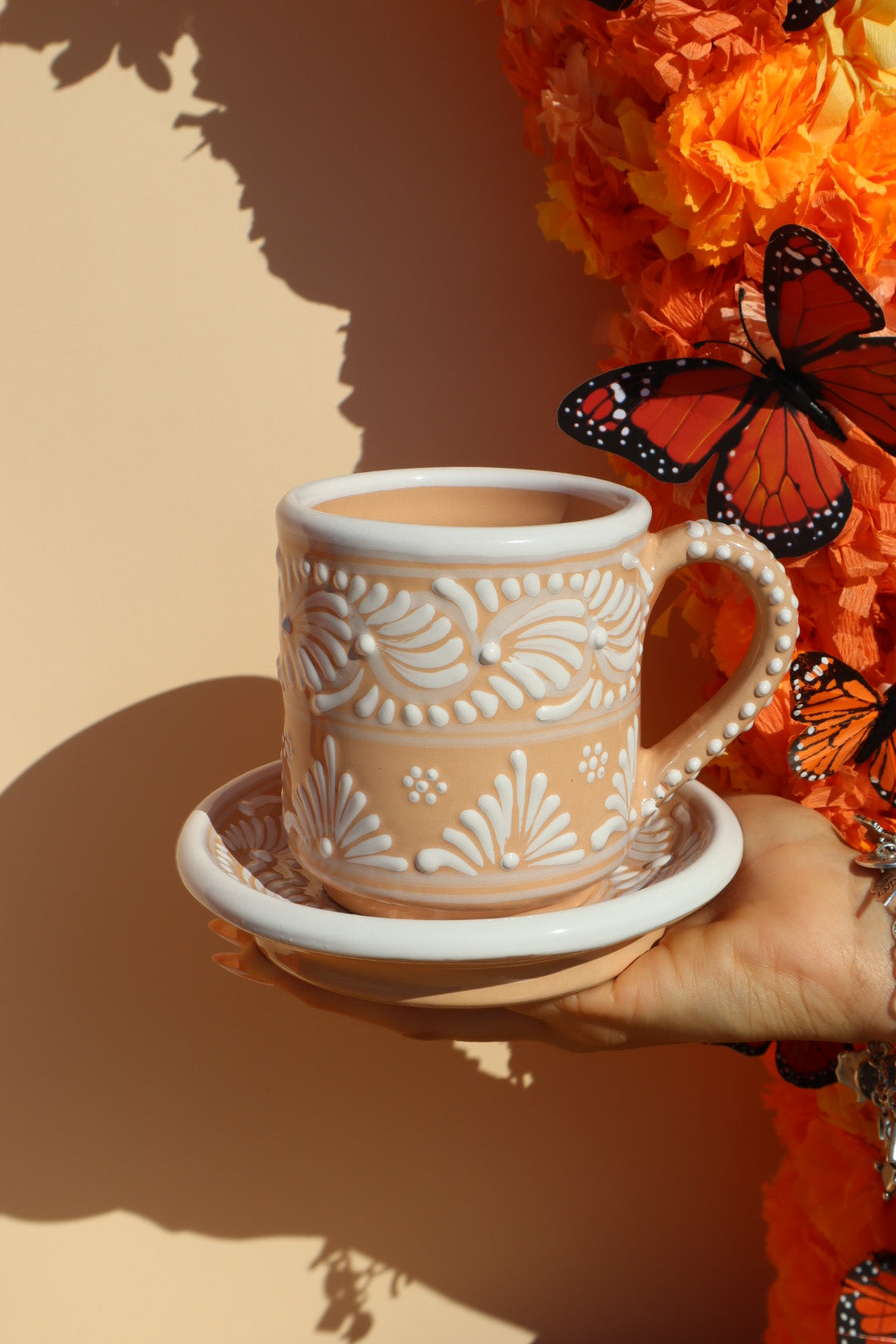 This set is crafted from genuine Talavera ceramic, known for its vibrant colors and durable glaze. Each piece features a gorgeous hand-painted design that includes the symbolic Monarch butterfly surrounded by rich, stylized floral or fan motifs. The set includes a mug and a matching saucer, perfect for catching drips or serving a small pastry.