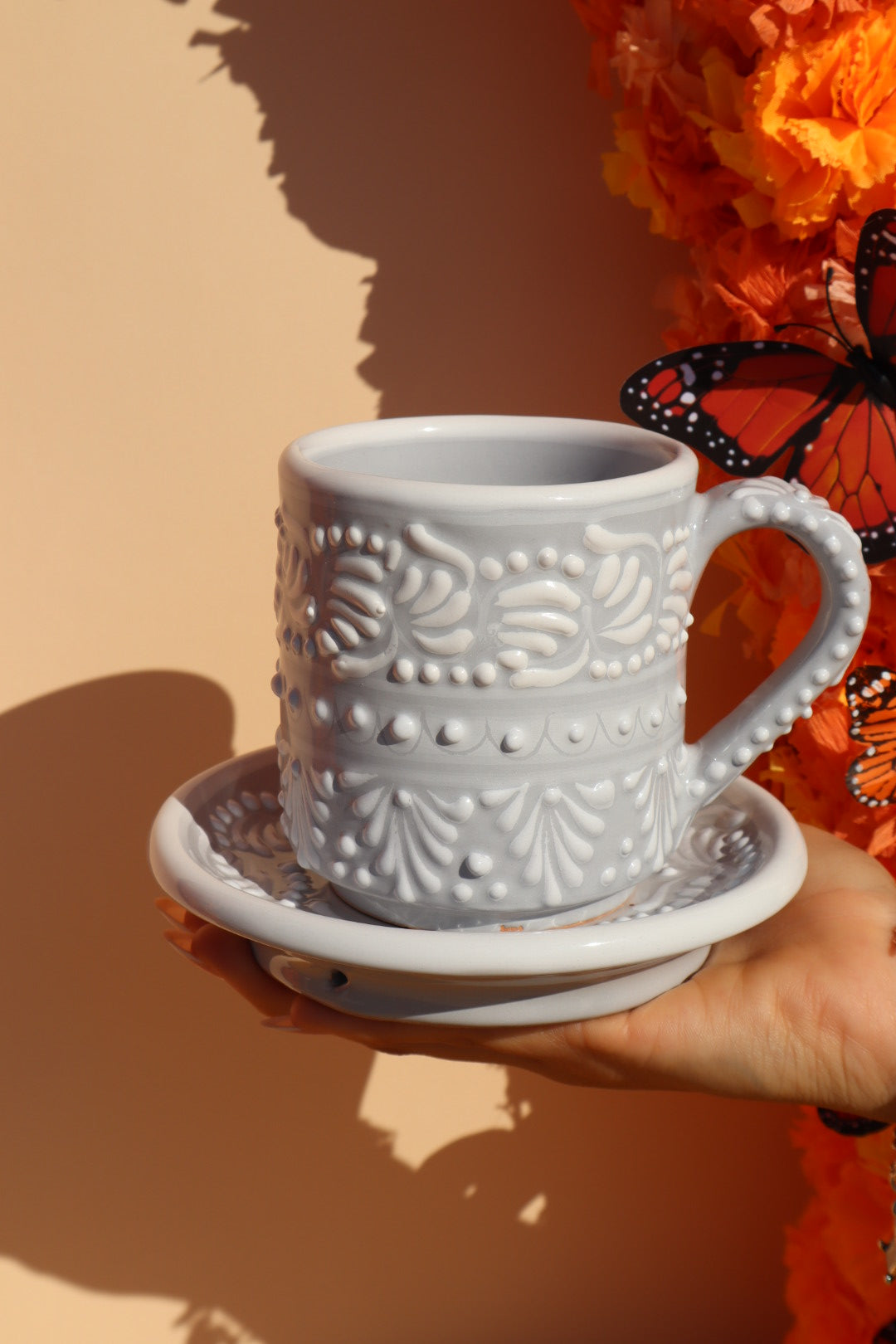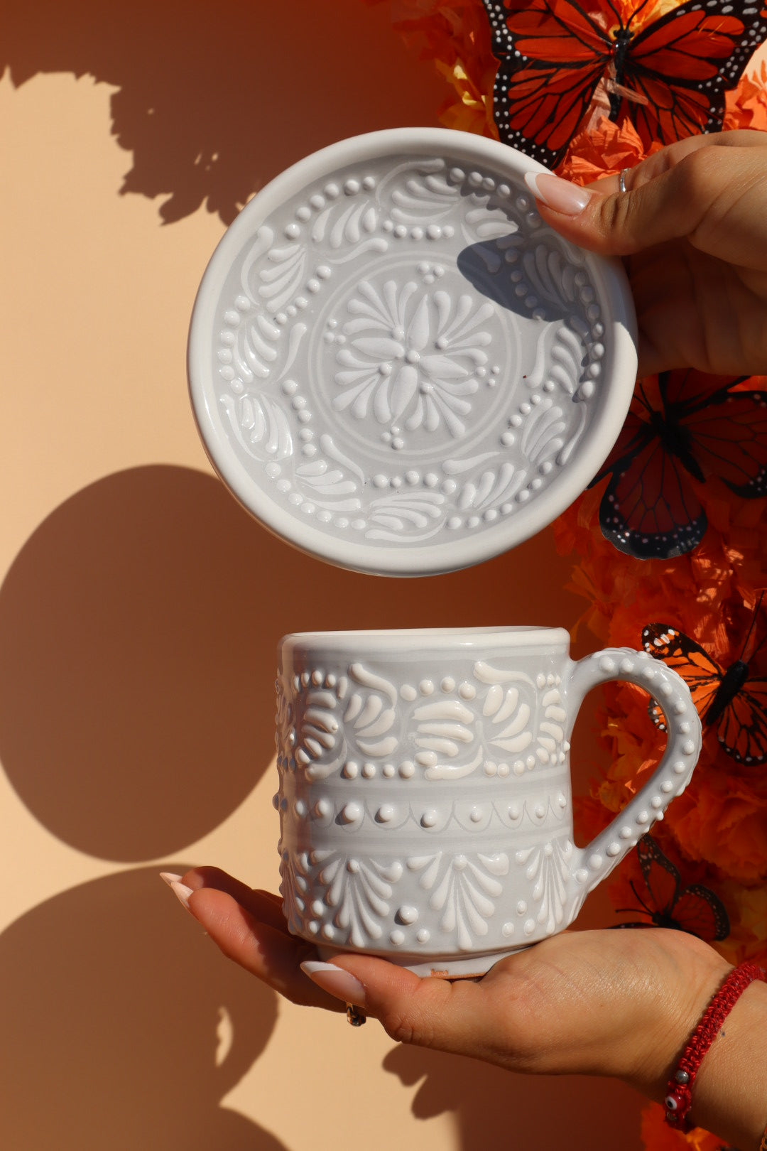This set is crafted from genuine Talavera ceramic, known for its vibrant colors and durable glaze. Each piece features a gorgeous hand-painted design that includes the symbolic Monarch butterfly surrounded by rich, stylized floral or fan motifs. The set includes a mug and a matching saucer, perfect for catching drips or serving a small pastry.