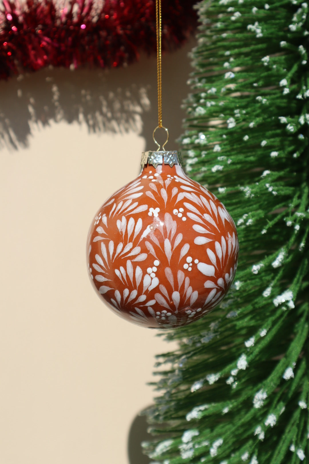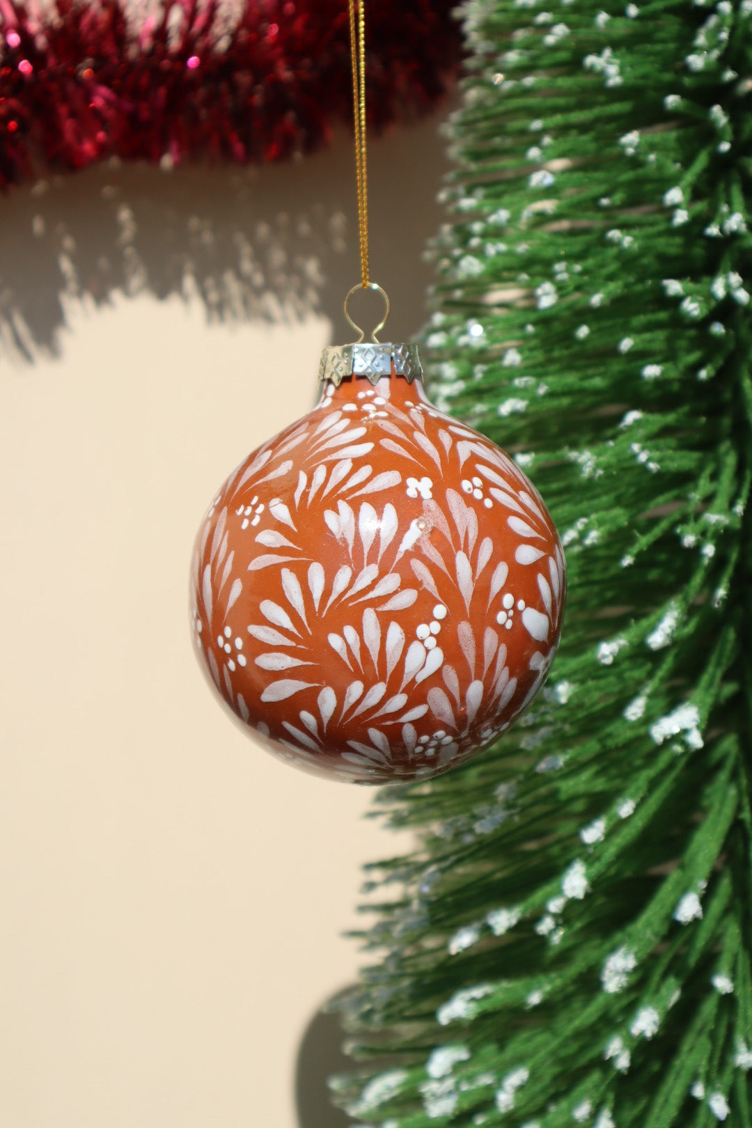 Made by skilled local artisans, this sphere ornament showcases the region's renowned pottery tradition and design. The piece features a warm, rich terracotta or reddish-brown base color, beautifully contrasted by a delicate, all-over pattern of hand-painted white strokes. The intricate detailing gives the ornament a sophisticated, natural, and cozy feel.