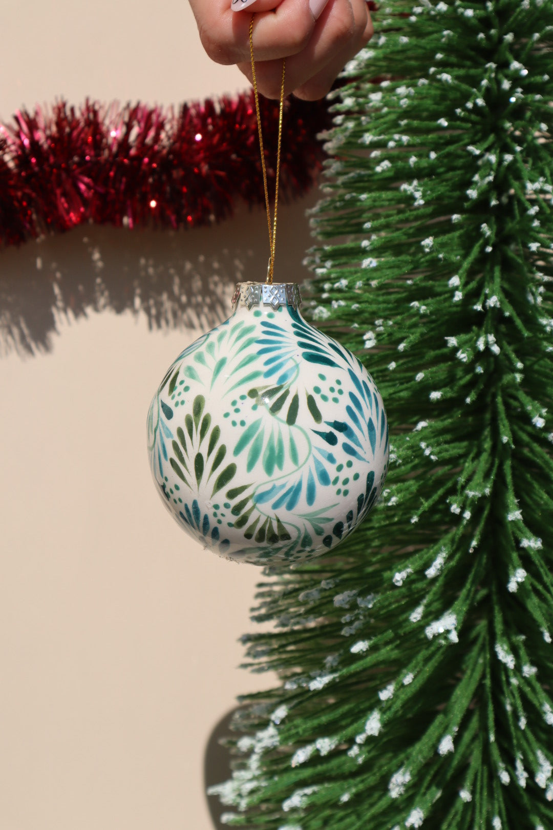 Made by skilled local artisans, this ornament showcases a striking palette of cool blues and rich teal greens against a crisp, white background. It features a delicate, all-over pattern of hand-painted leaves and foliage, reminiscent of water-inspired designs. The layered, vibrant brushstrokes give the ornament an incredible sense of depth and artistry.