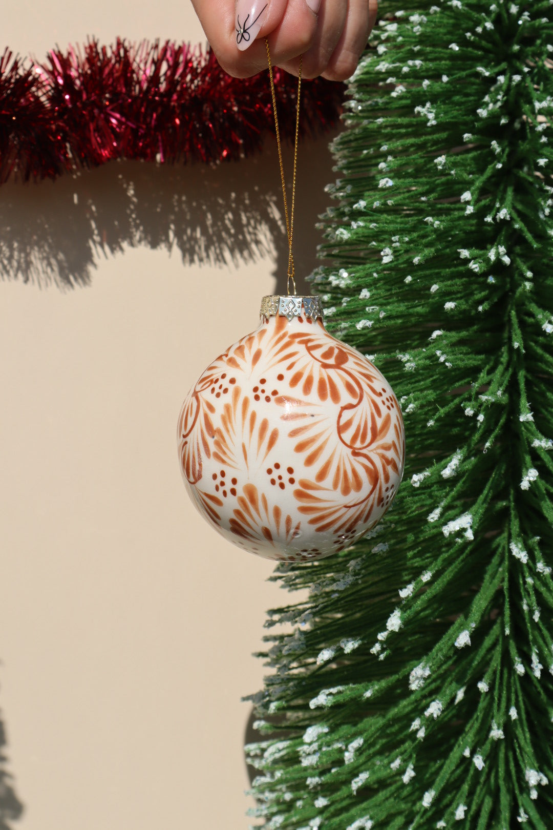 Made by skilled local artisans, this sphere ornament features a creamy white or light beige background beautifully detailed with warm brown accents. The all-over pattern of stylized leaves and dots is applied using the traditional "Plumeado" (feathered brushstroke) technique. This delicate brushwork gives the ornament a wonderful sense of movement and texture.