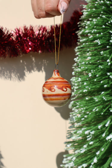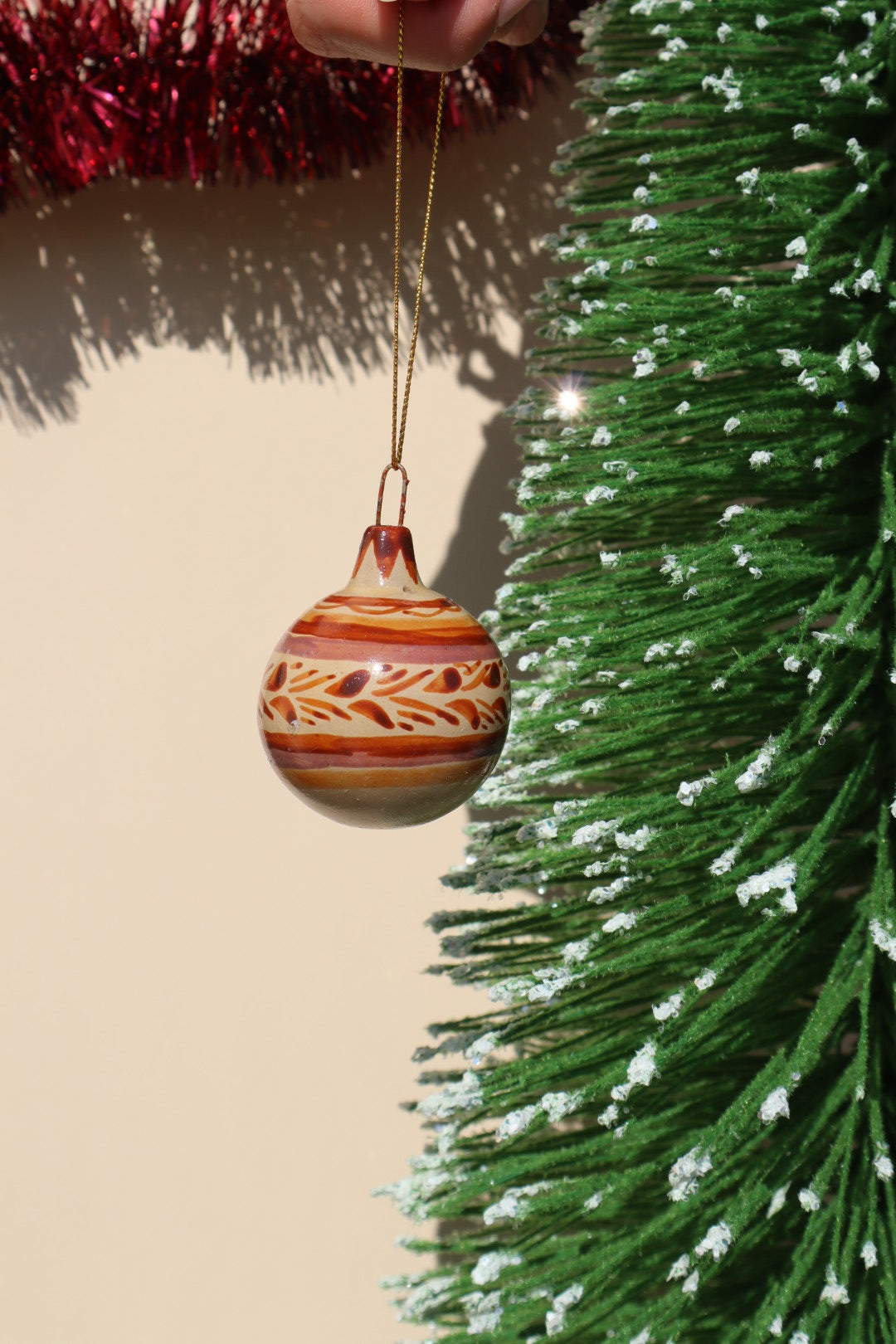 Crafted in the style of traditional Jalisco ceramics, each ornament showcases the region's signature warm, earthy color palette: natural terracotta, deep sienna, and bright ochre. The surfaces are meticulously detailed with the iconic swirl and geometric patterns characteristic of Jalisco pottery, giving every piece a rich, authentic, and collectible quality.