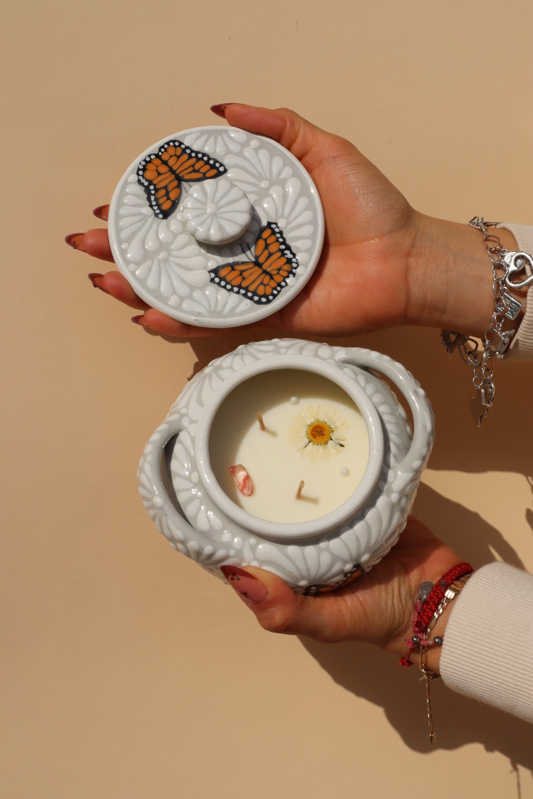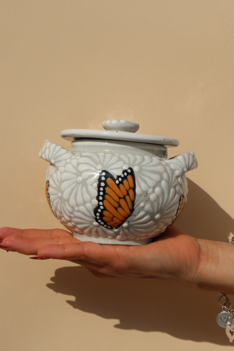 The De Por Vida (Monarca Edition) candle is a handmade Talavera item handmade in Puebla, Mexico. Hand-poured in Mesquite, Texas.