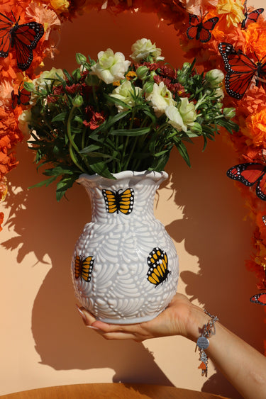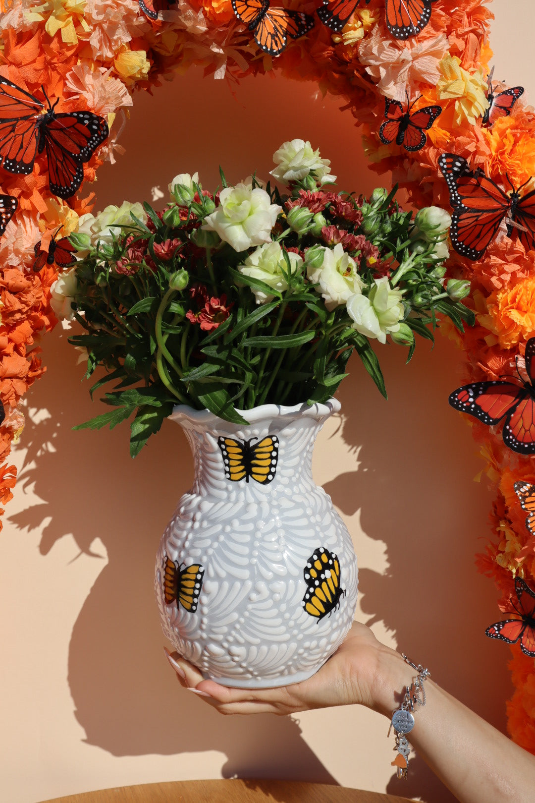 This vase is crafted from Talavera ceramic, showcasing the classic Talavera technique. It features a delicate, white and grey background that allows the Monarch butterfly motif to take center stage. It's a gorgeous representation of the yearly migration that links North America.