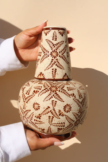 Embrace the warmth of Mexican tradition with this beautifully redesigned Cántaro and cup set. Crafted by the same skilled artisans in the Estado de México, this piece offers a sleek, contemporary take on the classic Mexican water jug while retaining the exquisite hand-painted detail.