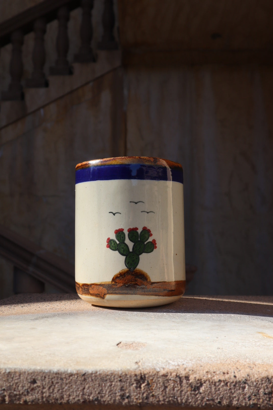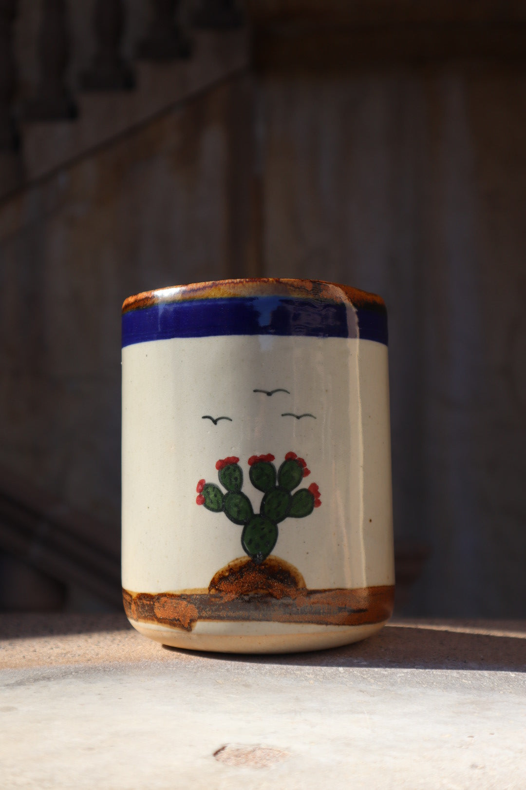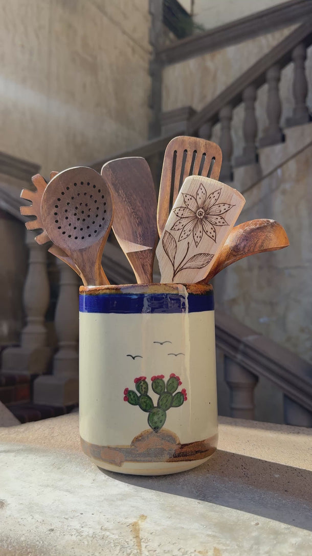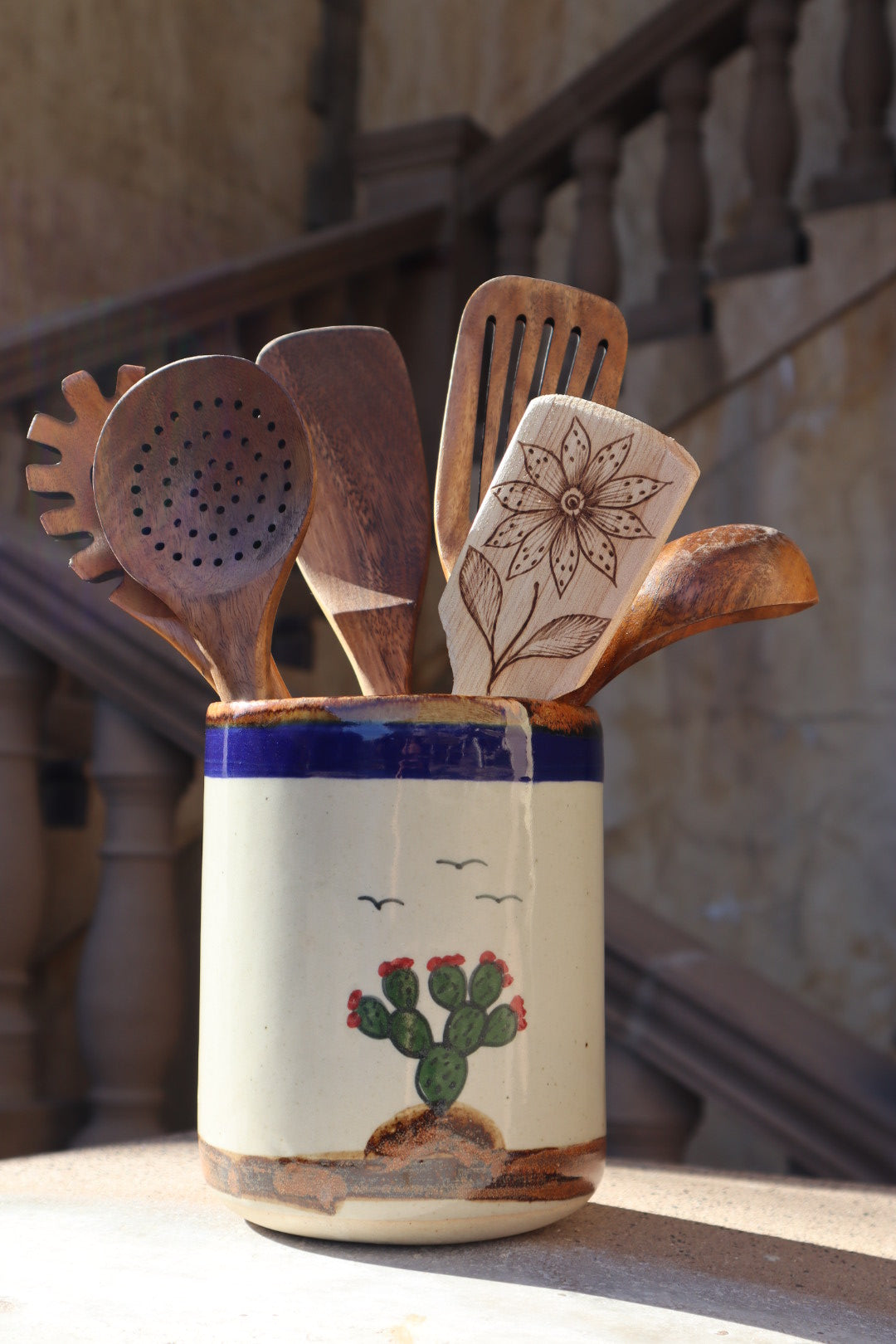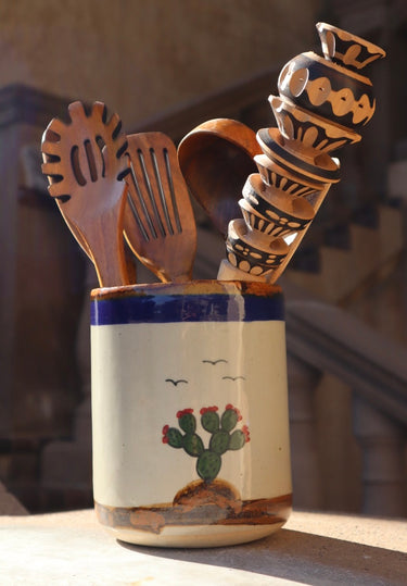 Bring the rustic charm of a Mexican country kitchen into your home with the Nopales Utensil Holder. This practical, yet beautiful canister is handcrafted in the Estado de México as a perfect expression of the slow, rancho style life celebrated in our Tierra Linda collection.