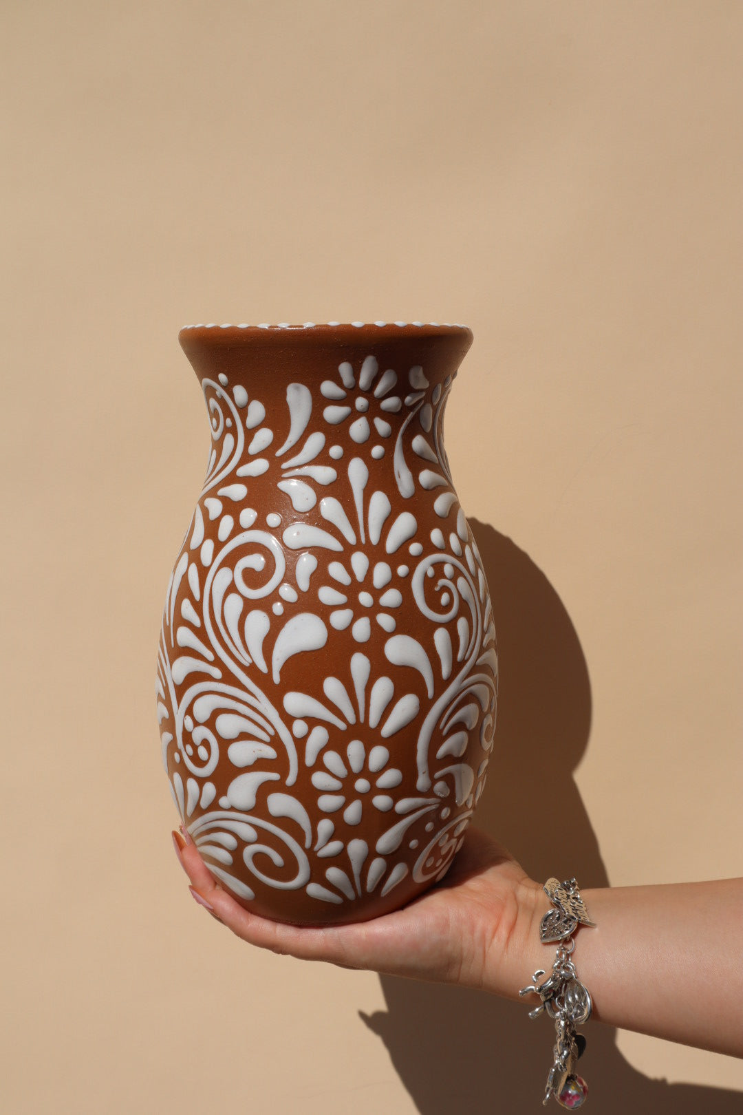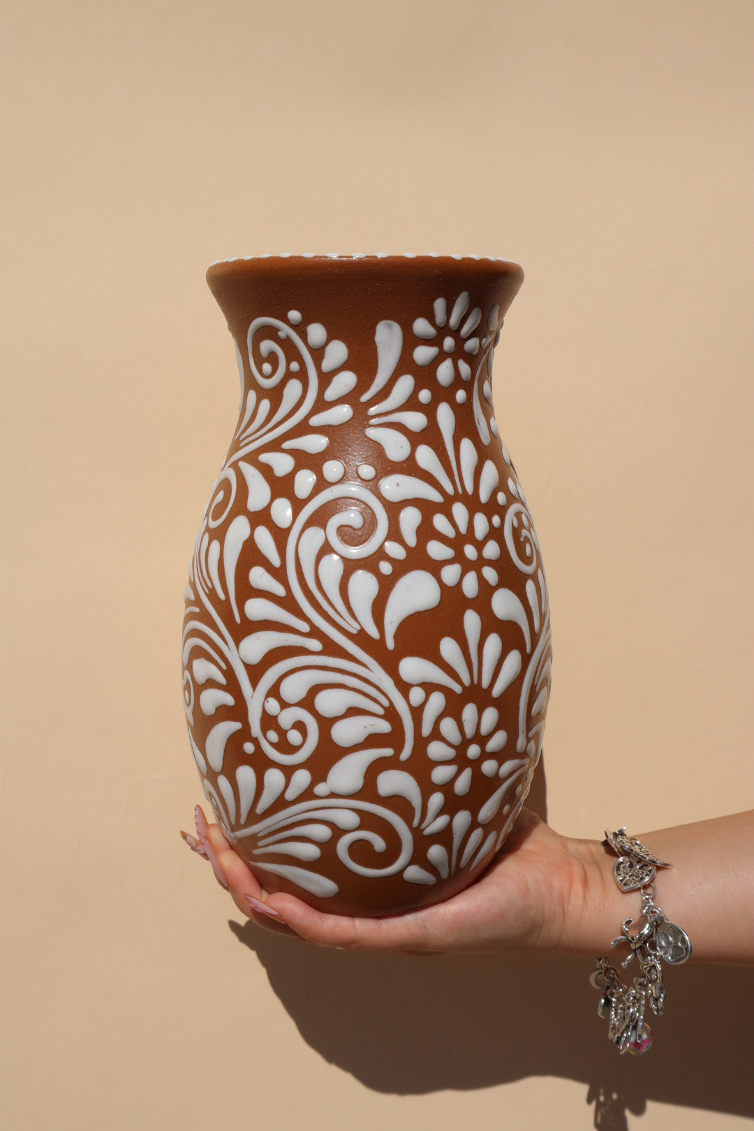 Bring the vibrant beauty of Guanajuato into your home with our stunning "Flores de Guanajuato" vase. This traditional-style vase is a testament to Mexican craftsmanship, handmade with care and painted with the delicate "plumeado" style strokes that are a hallmark of Guanajuato artistry.