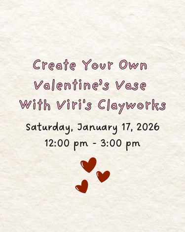 Join us for a special, cozy, hands-on clay class with ceramic artist Viri Avina of Viri's Clayworks, where you'll create a beautiful flower vase just in time for Valentine’s Day! Whether you're making a gift for a loved one or a treat for yourself, this workshop is the perfect way to celebrate the season of love.