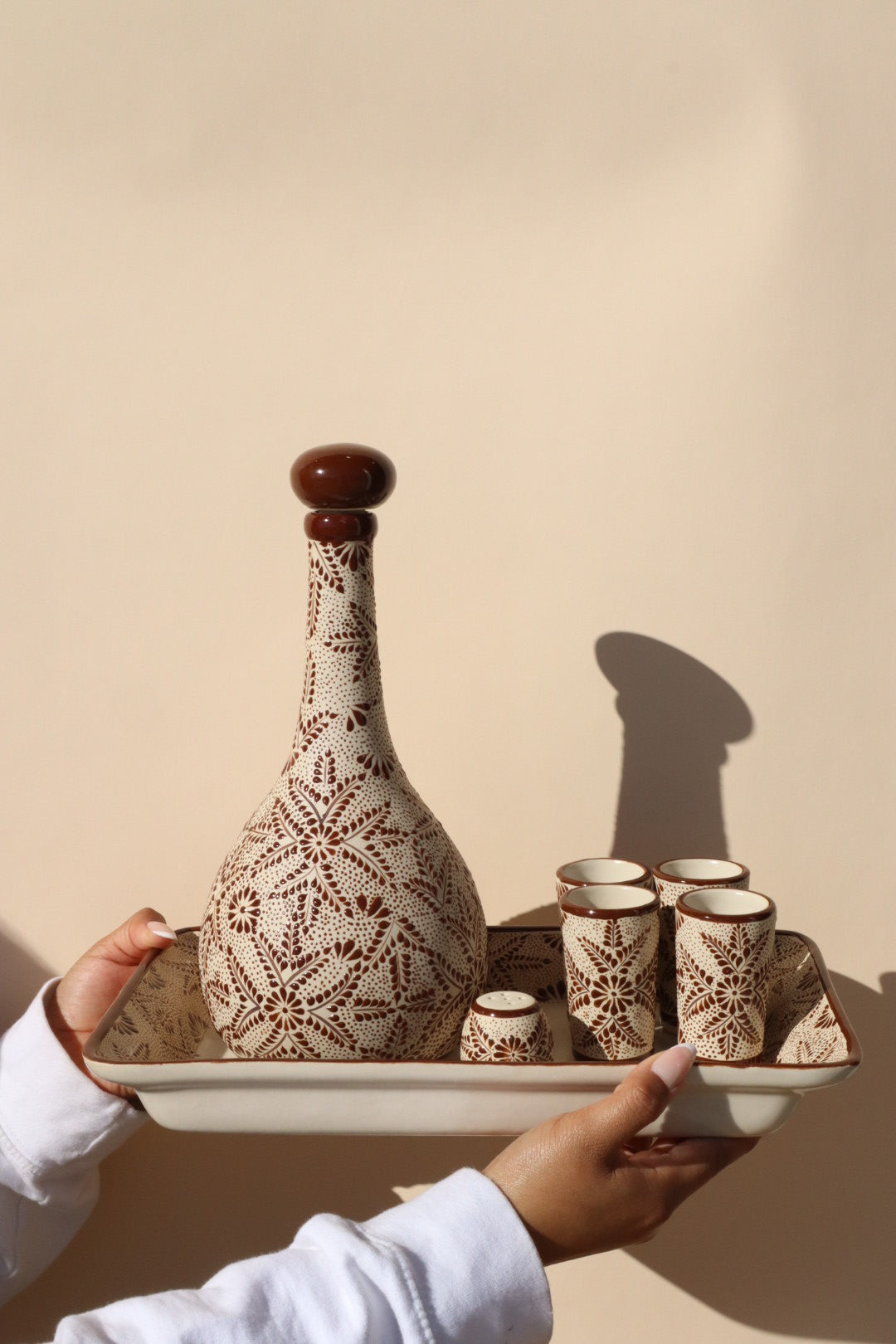 Elevate your entertaining with this exquisite, one-of-a-kind tequilero set, a celebration of authentic Mexican artistry. Each piece is meticulously hand-painted by skilled artisans in the Estado de México, making this a unique centerpiece for your home or a truly unforgettable gift.