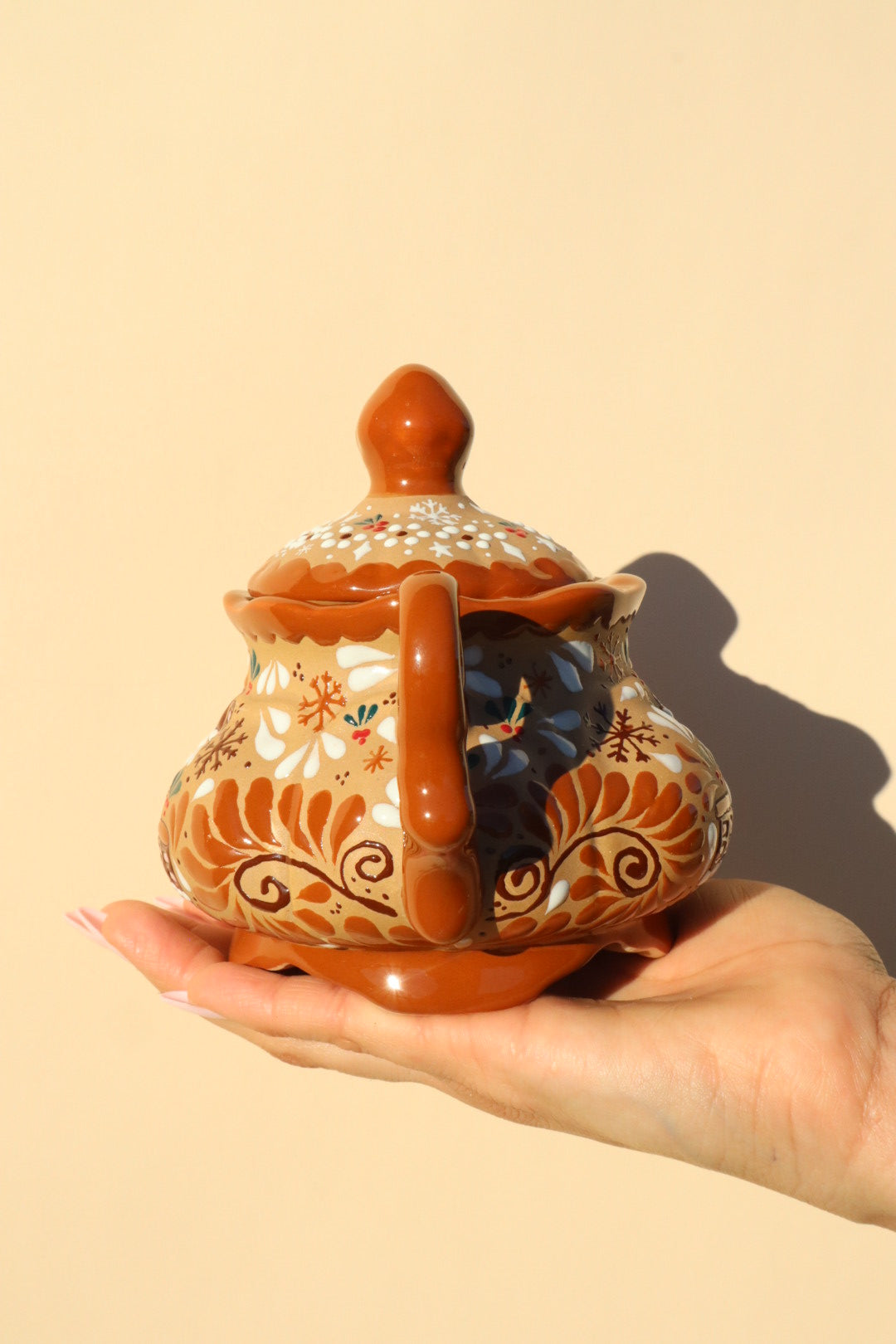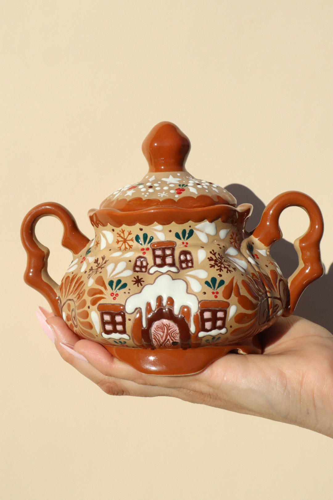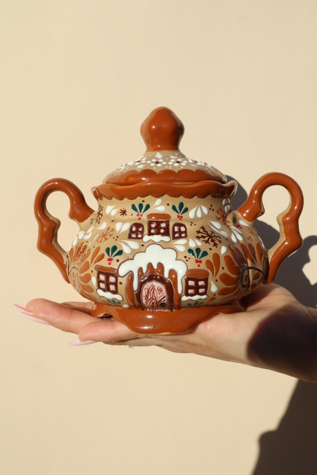 This stunning Ceramic Gingerbread Casita Pot is an exclusive piece that masterfully unites the beloved, cozy appeal of a gingerbread house with the vibrant, meticulous artistry of Mexican ceramics.