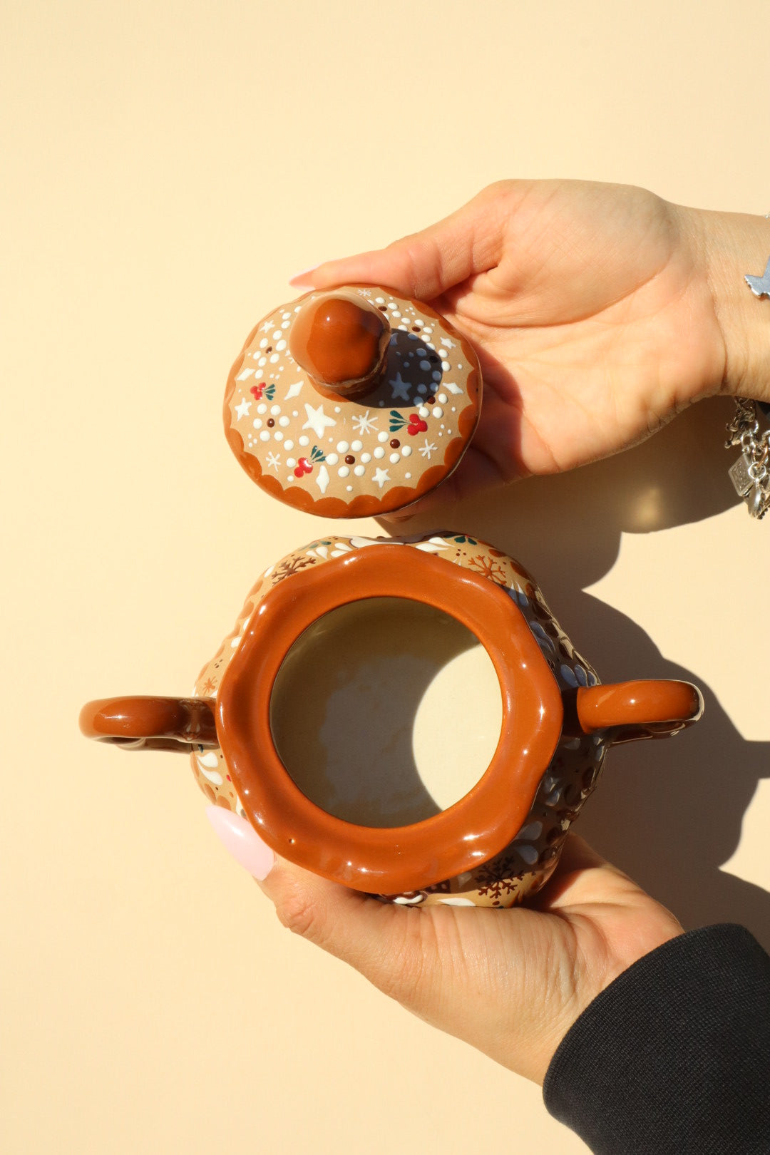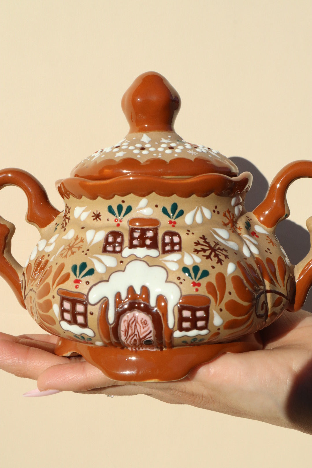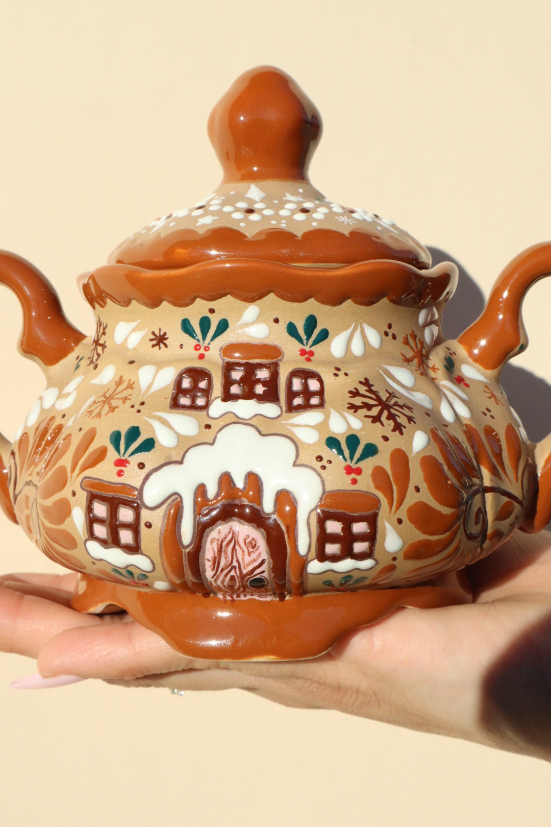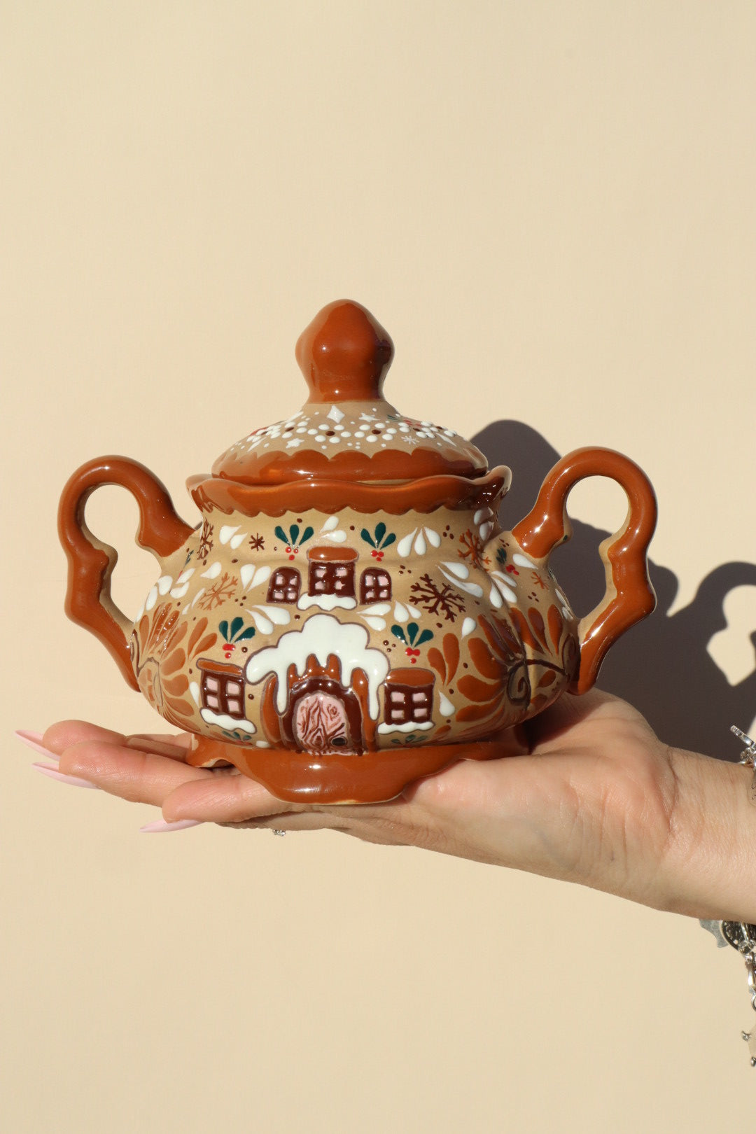 This stunning Ceramic Gingerbread Casita Pot is an exclusive piece that masterfully unites the beloved, cozy appeal of a gingerbread house with the vibrant, meticulous artistry of Mexican ceramics.