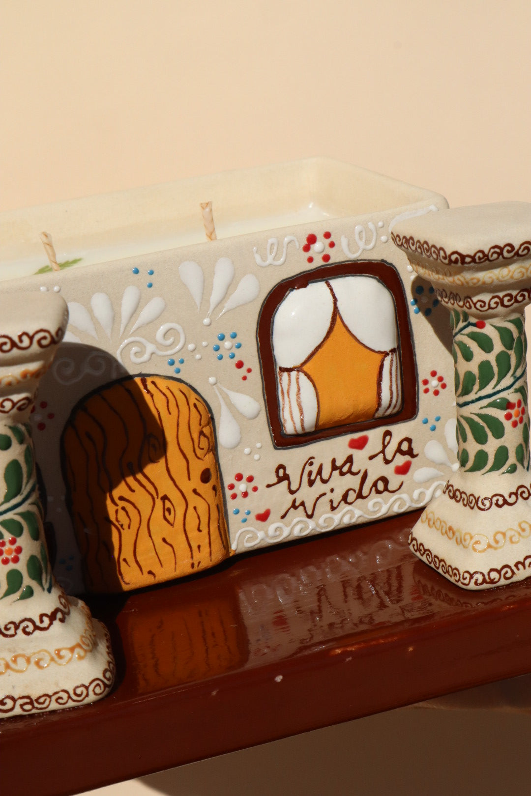 The Pueblito Casita (Pillars - Cream) Candle is one of the most intricately detailed pieces in our exclusive collection. Inspired by the authentic architecture and vibrant art of the Pueblitos de México, this unique house features decorative pillars and a stepped base.