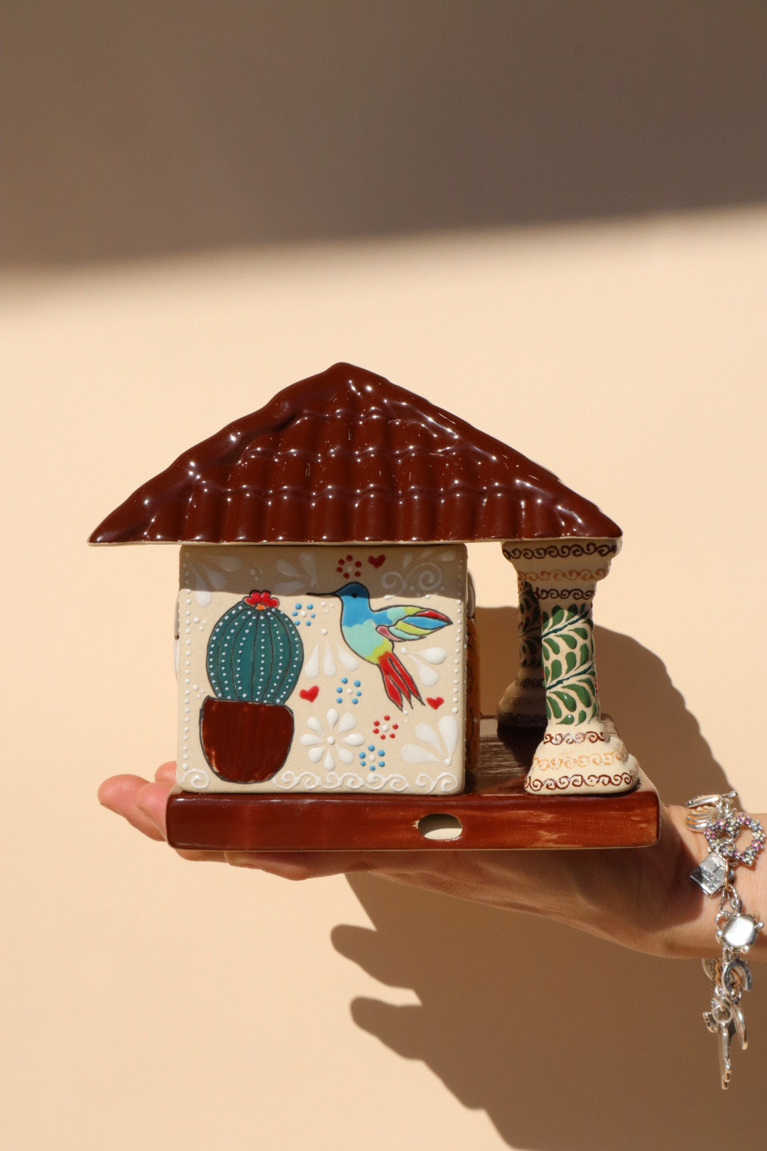 • The Look: The cream-colored house and pillars are adorned with rich, hand-painted floral and foliage motifs in traditional Mexican colors. The base is a high-gloss brown, and the roof is a beautiful, dark tile design. Charming details include the hand-painted window and the folk-art scrollwork.