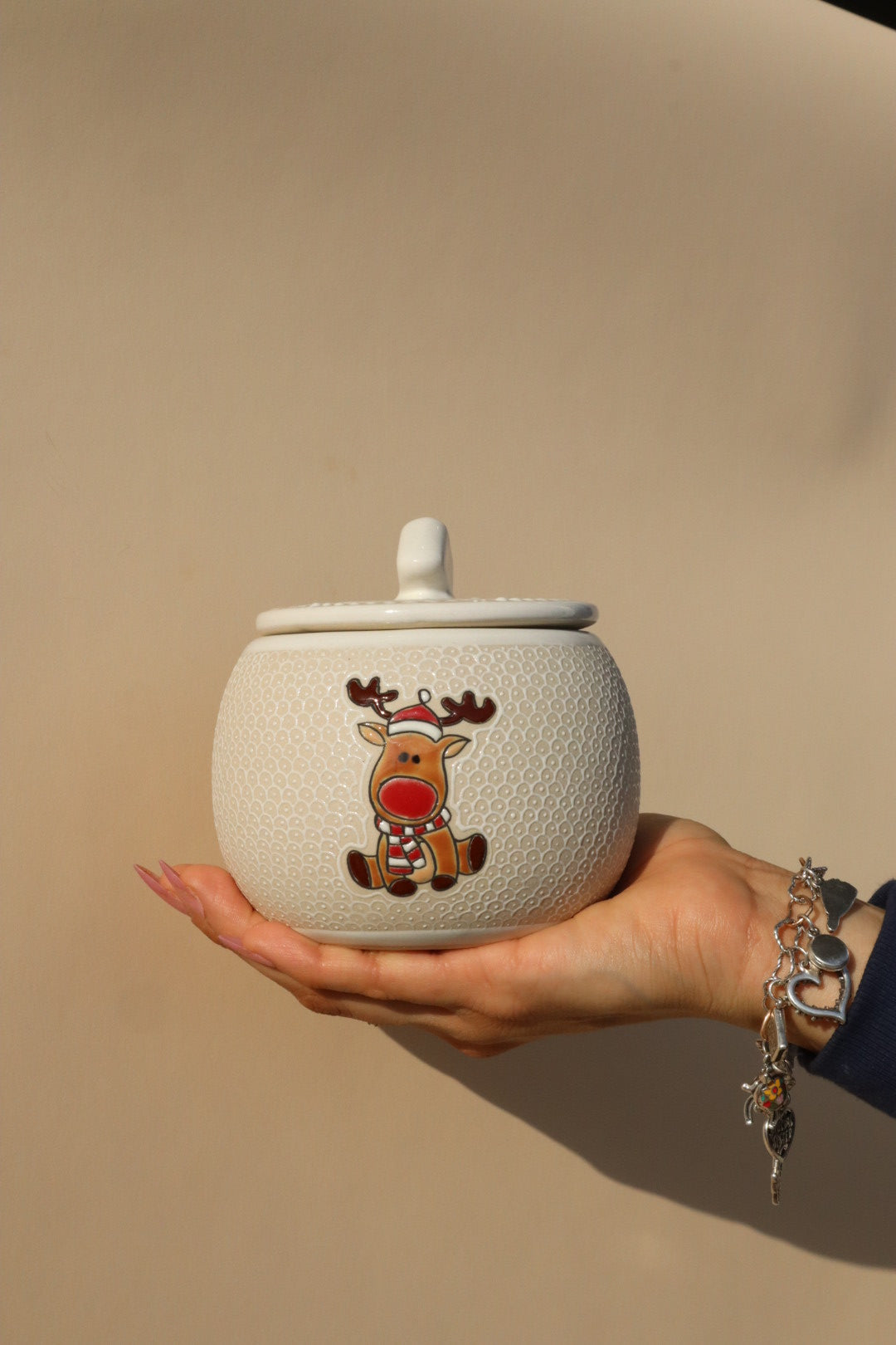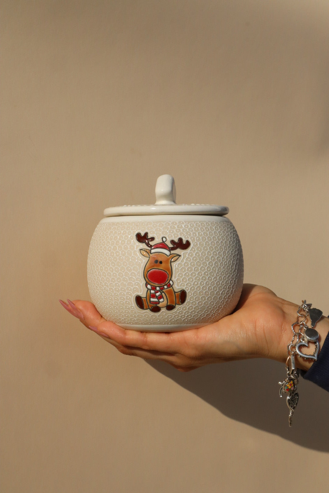 • Handcrafted Detail: The jar showcases a charming, hand-applied Red Nosed Reindeer decal and a lid featuring gorgeous, detailed scrollwork and a distinctive owl-like handle. The clean white glaze makes the festive accents and the unique jar structure truly stand out.