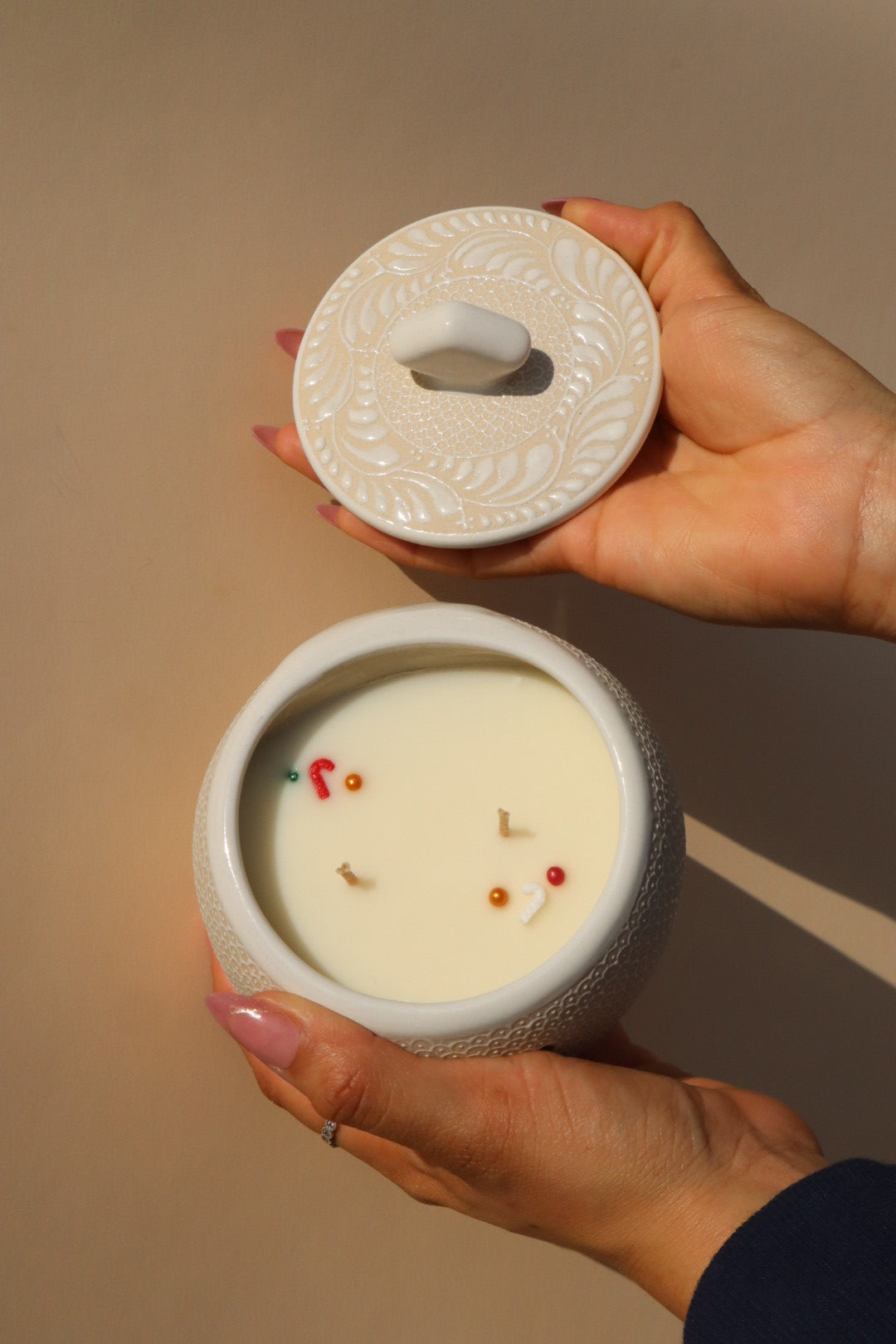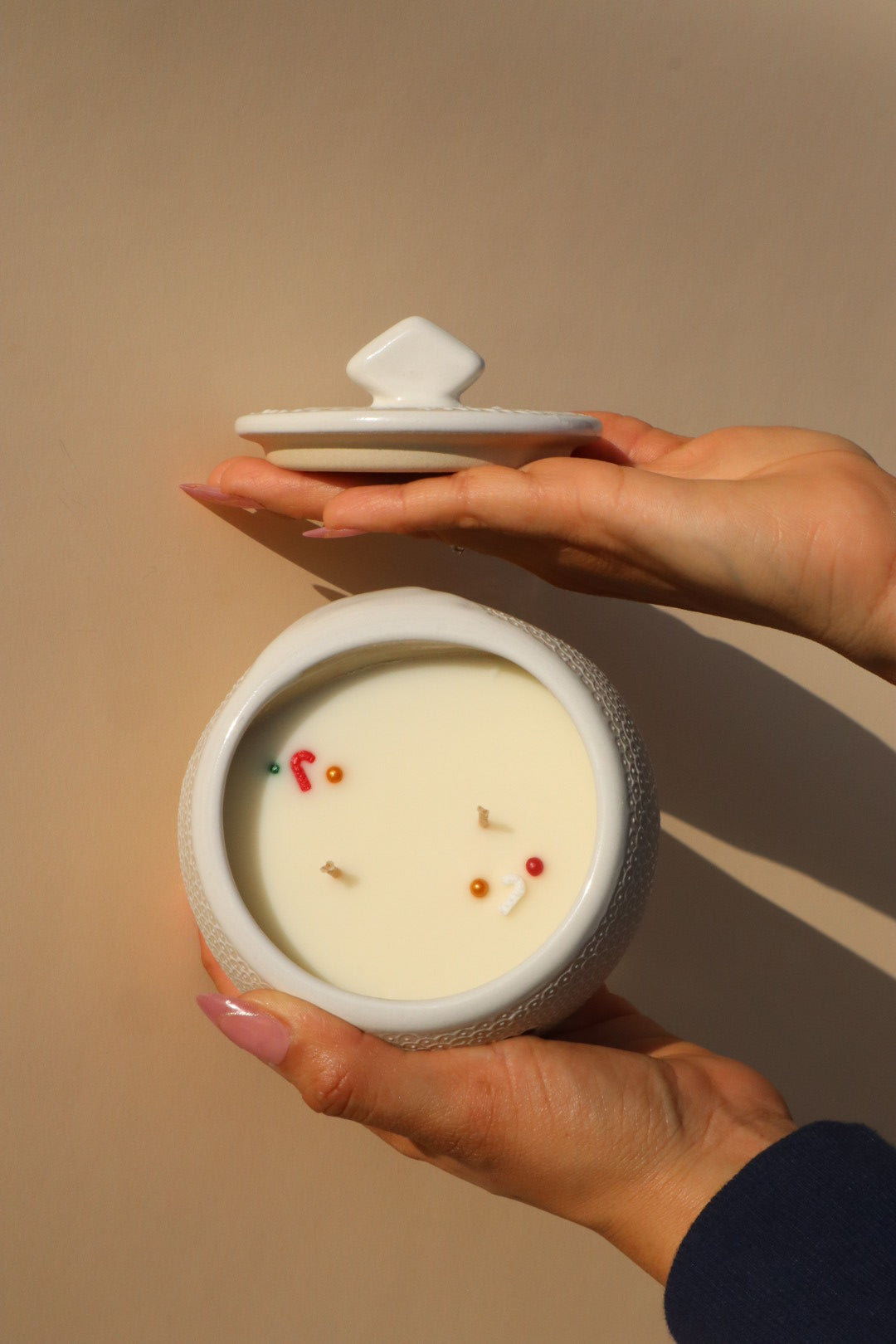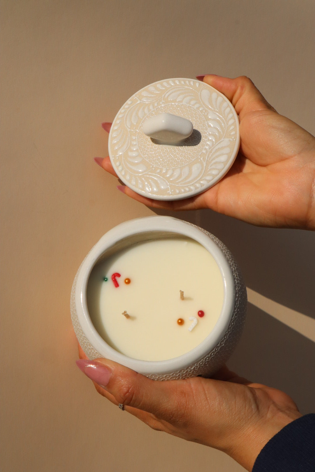 • The Candle: Contains a generous 12 oz. of 100% soy wax, topped with playful holiday wax sprinkles.