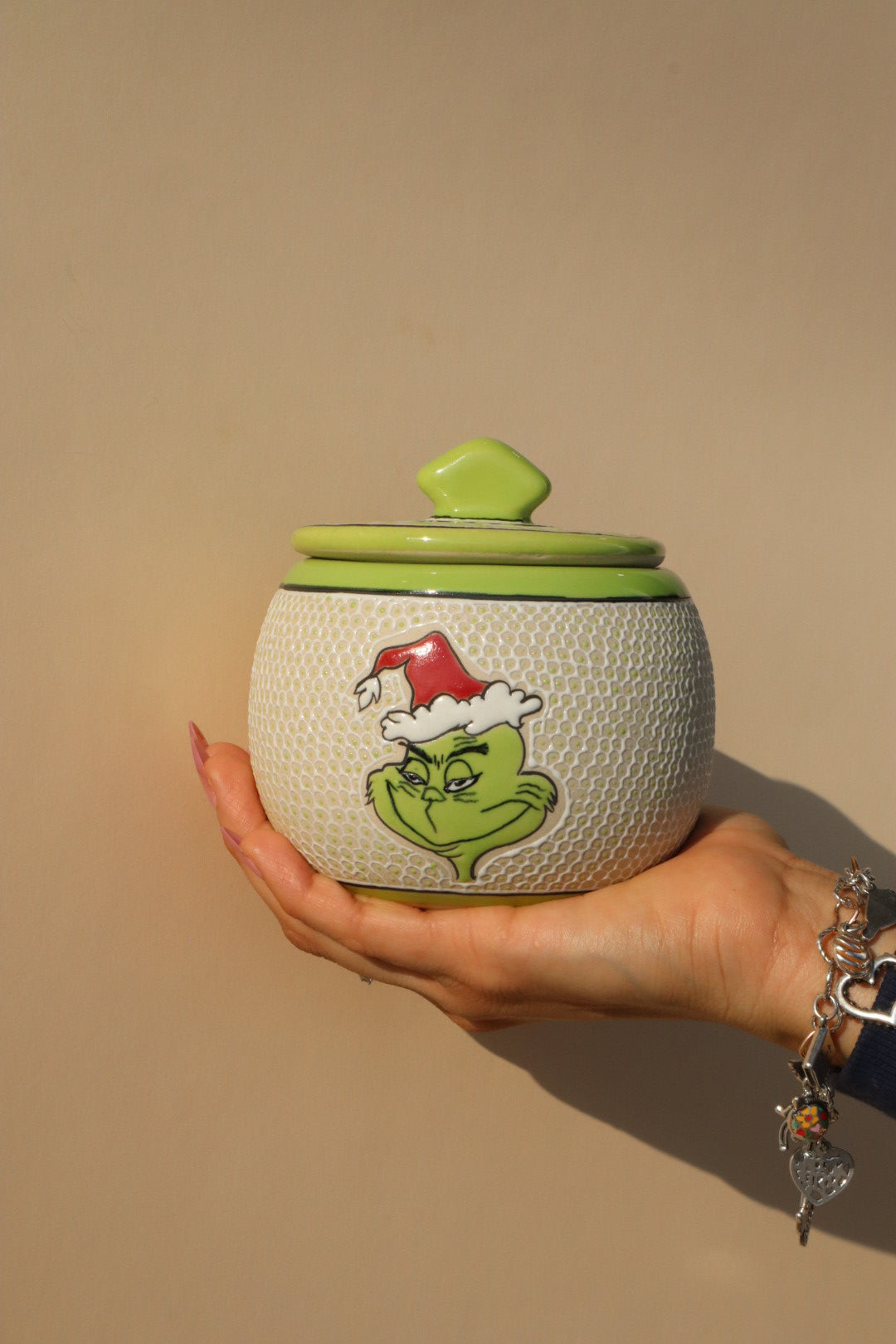 Handcrafted Detail: Featuring a striking Lime Green glaze that cuts across the textured white body, this piece is topped with a lid featuring a distinctive owl-like handle. The fun, hand-panted "You're a Mean One" character adds a wonderfully cheeky touch to your holiday display.