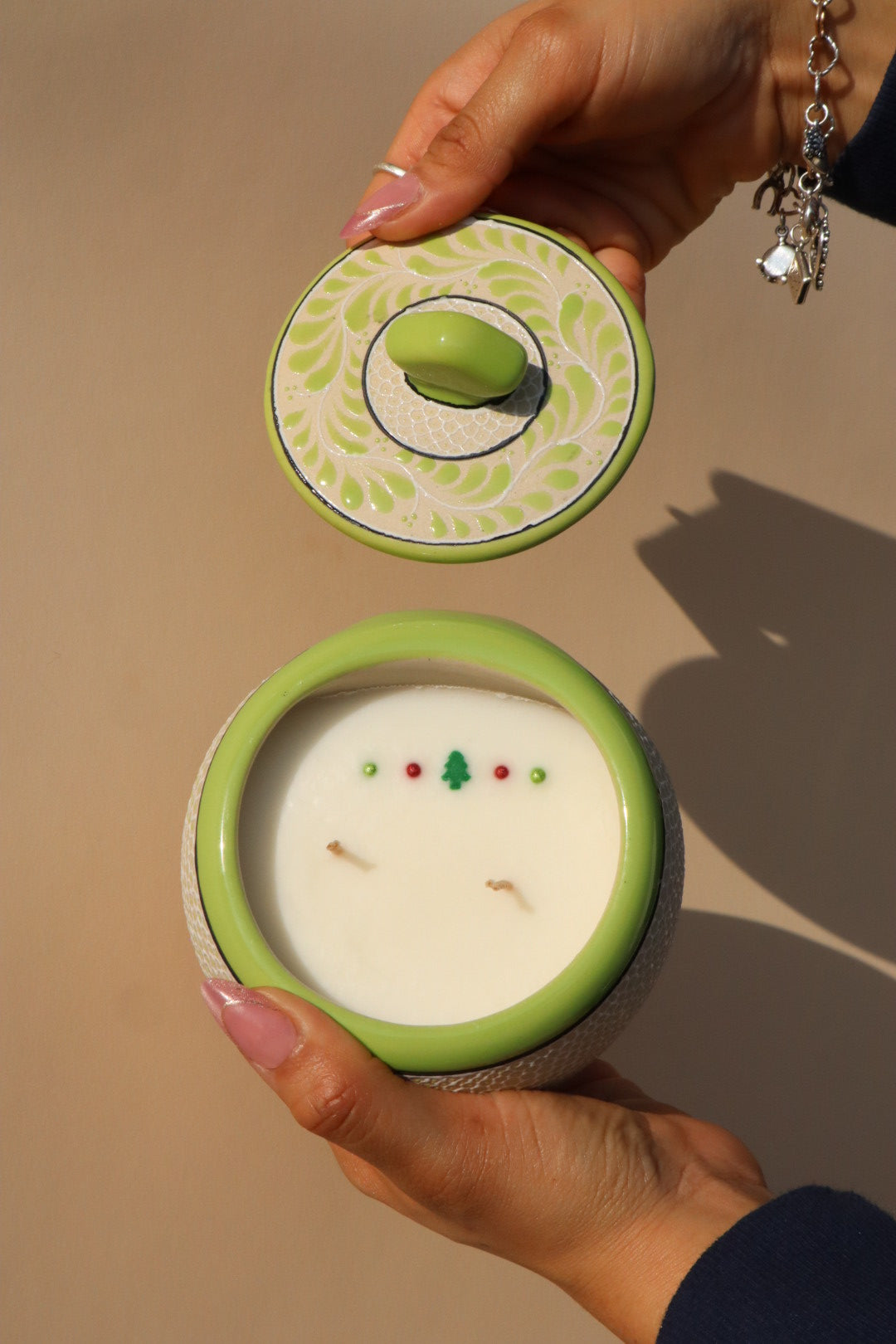 Unleash a little holiday mischief with our "You're a Mean One" Candle! This vibrant and playful piece is housed in a unique, lidded ceramic vessel, meticulously handcrafted by skilled artisans in the Estado de México. It is an exclusive design for Luz y Tierra, adapted from the traditional Taza Búho mug form.