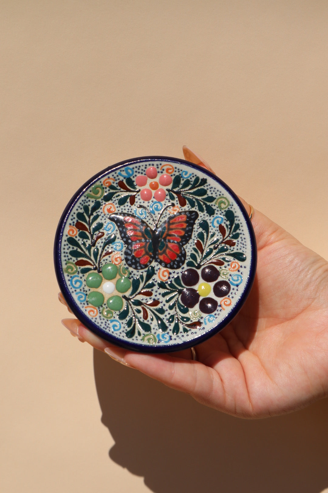 Adorn your walls with a miniature burst of Mexican artistry. This charming Mini Jardin Wall Trinket Decor, also known as a Platito (small plate). Traditionally crafted on a pottery wheel in Guanajuato, Mexico, each piece is a meticulous work of functional art.