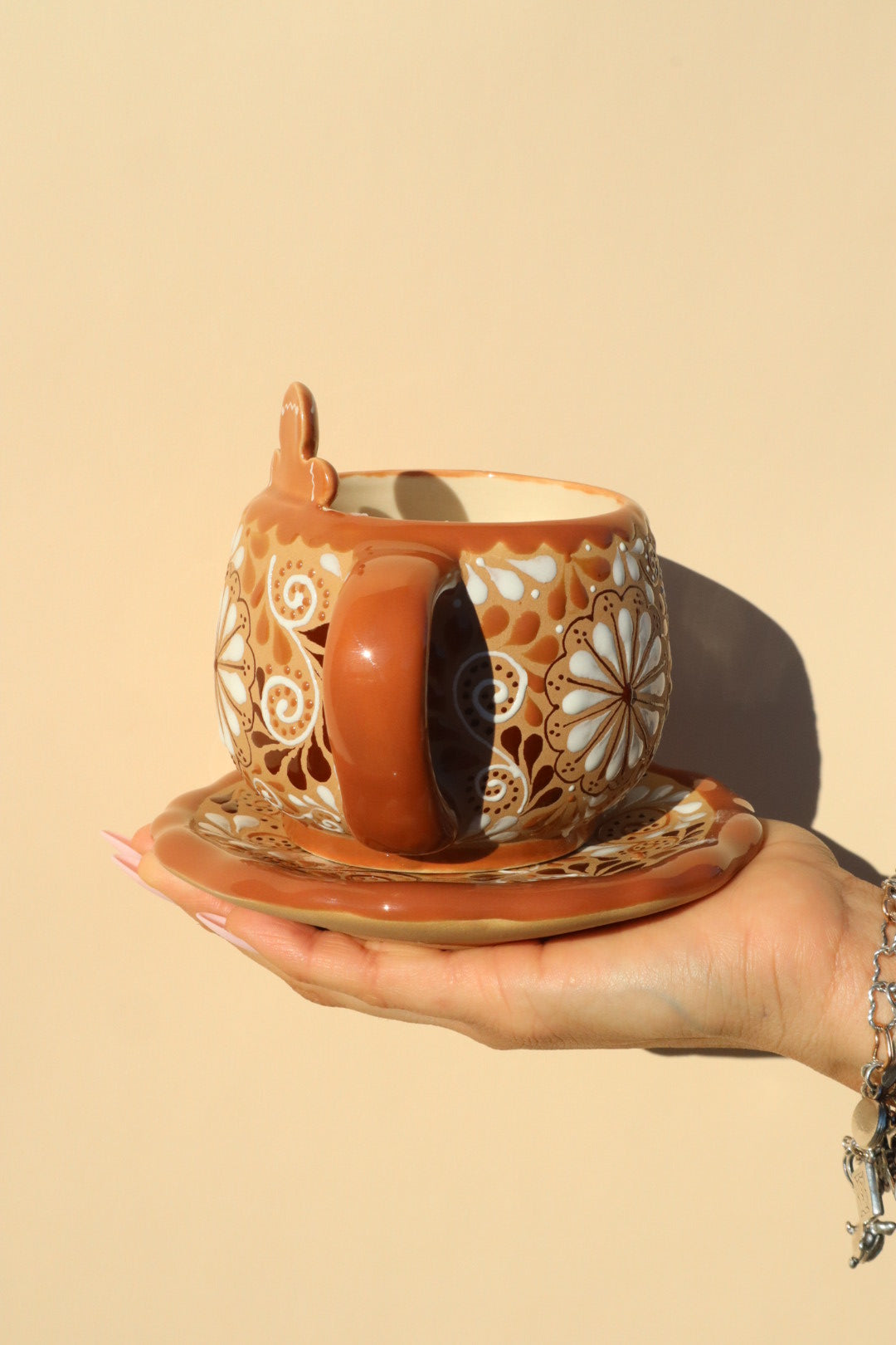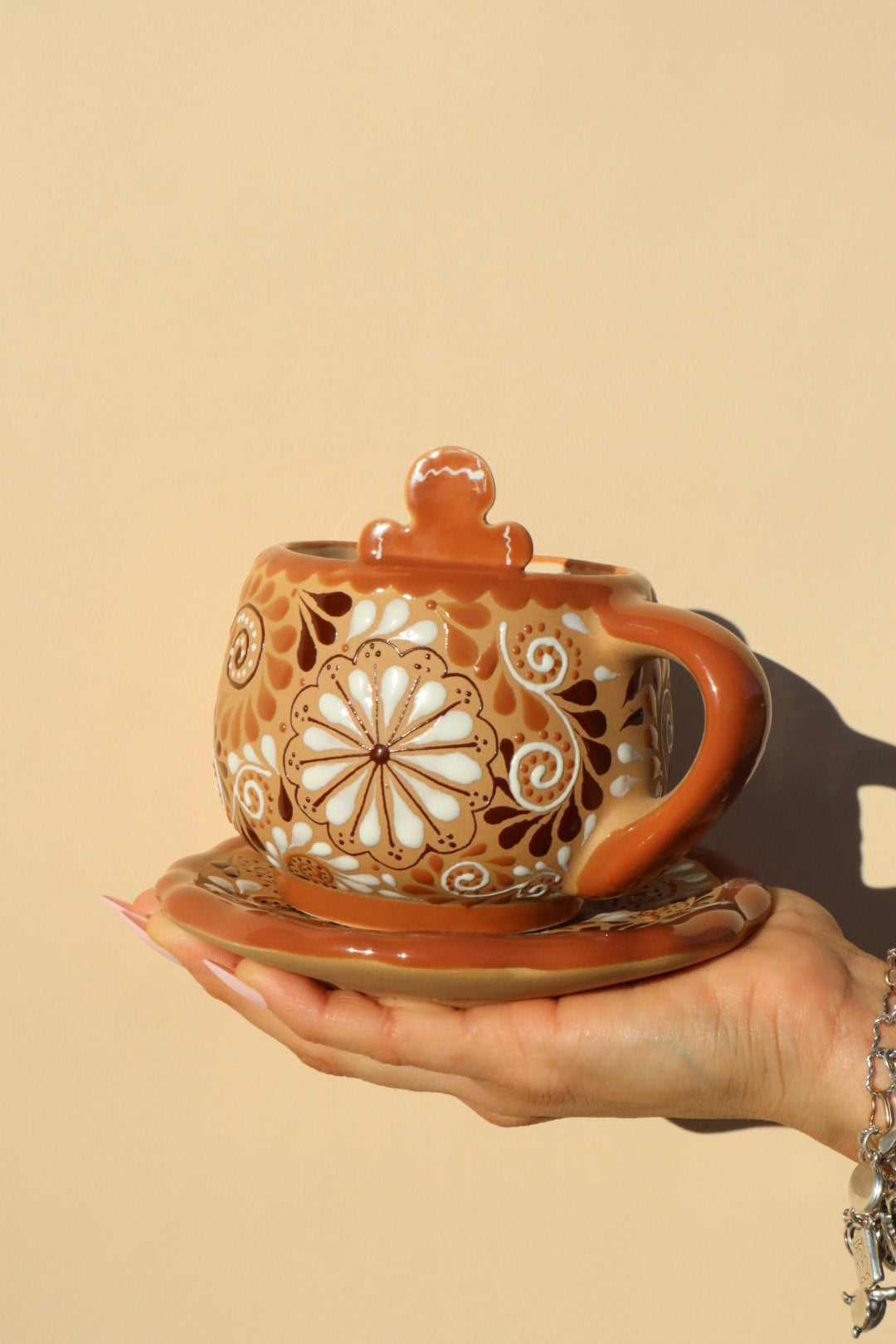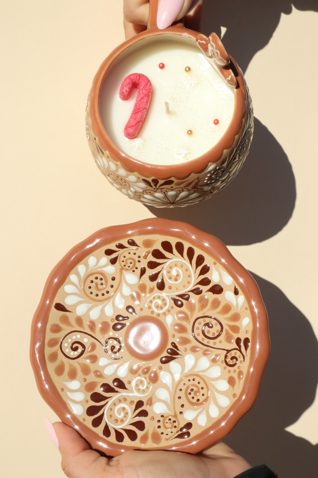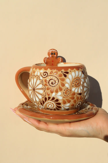 - The Tacita: The generously sized mug is decorated with a beautiful hand-painted pattern of festive swirls and flowers in white slip over an inviting, earthy brown clay. The handle is topped with an adorable 3D Gingerbread Man wax accent when you receive the set, and the mug itself is perfect for your favorite hot holiday drink.