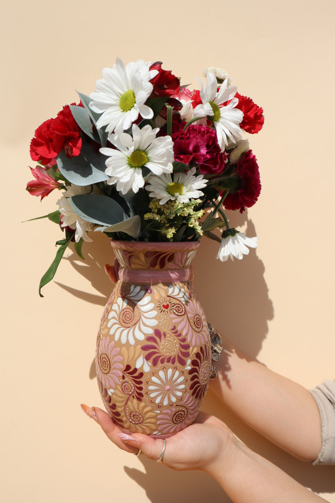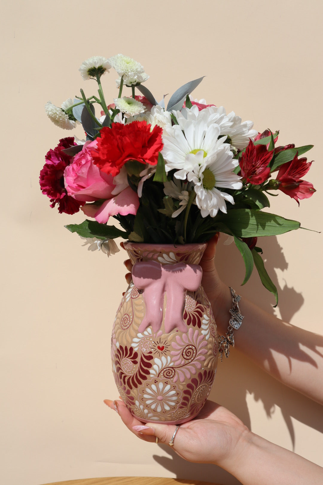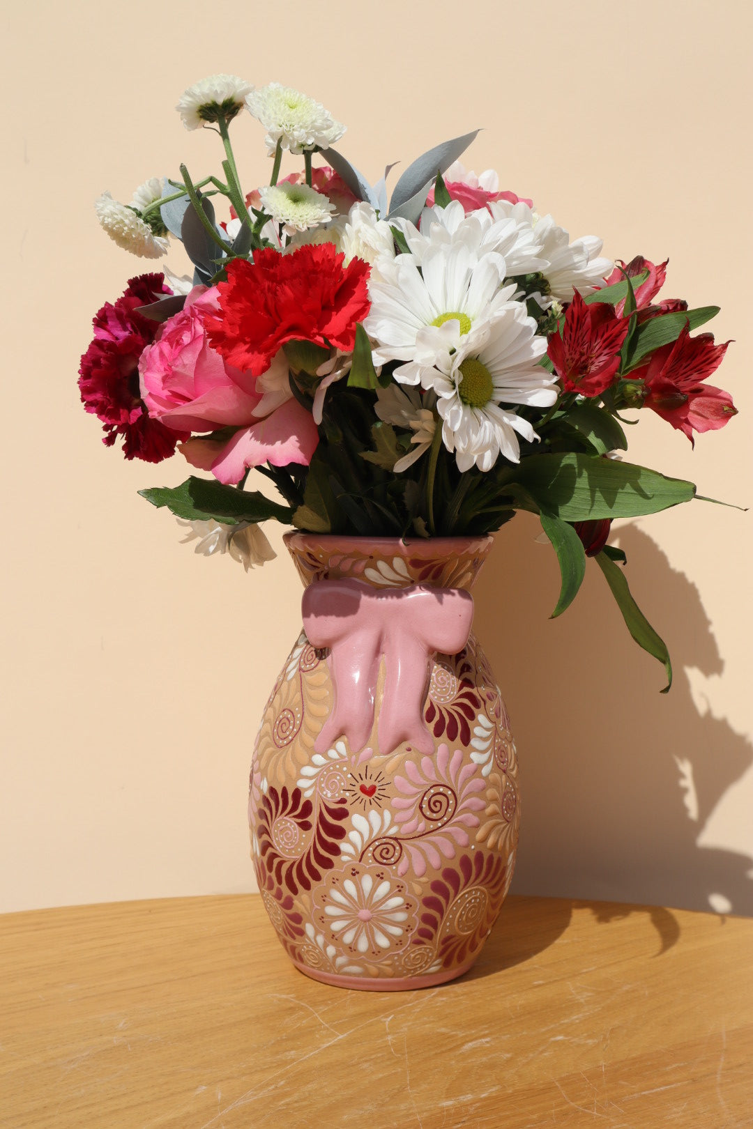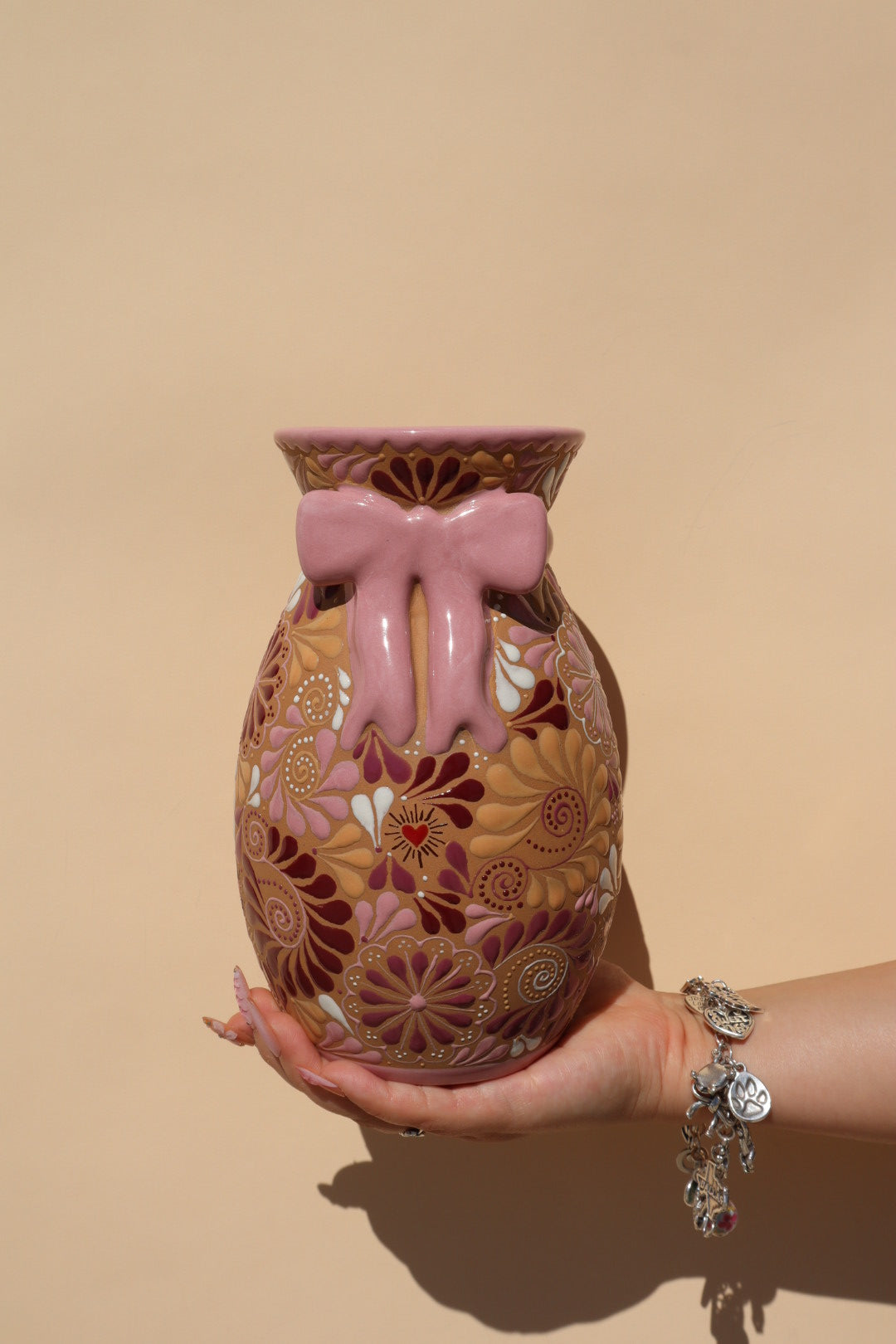 Discover the breathtaking beauty of the Rosita Bow Vase, where traditional artistry meets a modern, romantic soul. A standout highlight of our Amor Collection, this piece is handcrafted in Estado de México and features a stunning 3D pink bow accent that wraps around the neck of the vase. Each one-of-a-kind vessel is a testament to the skill of our artisans, hand-painted with an explosion of vibrant pinks, reds, and plums in intricate linework and captivating patterns.