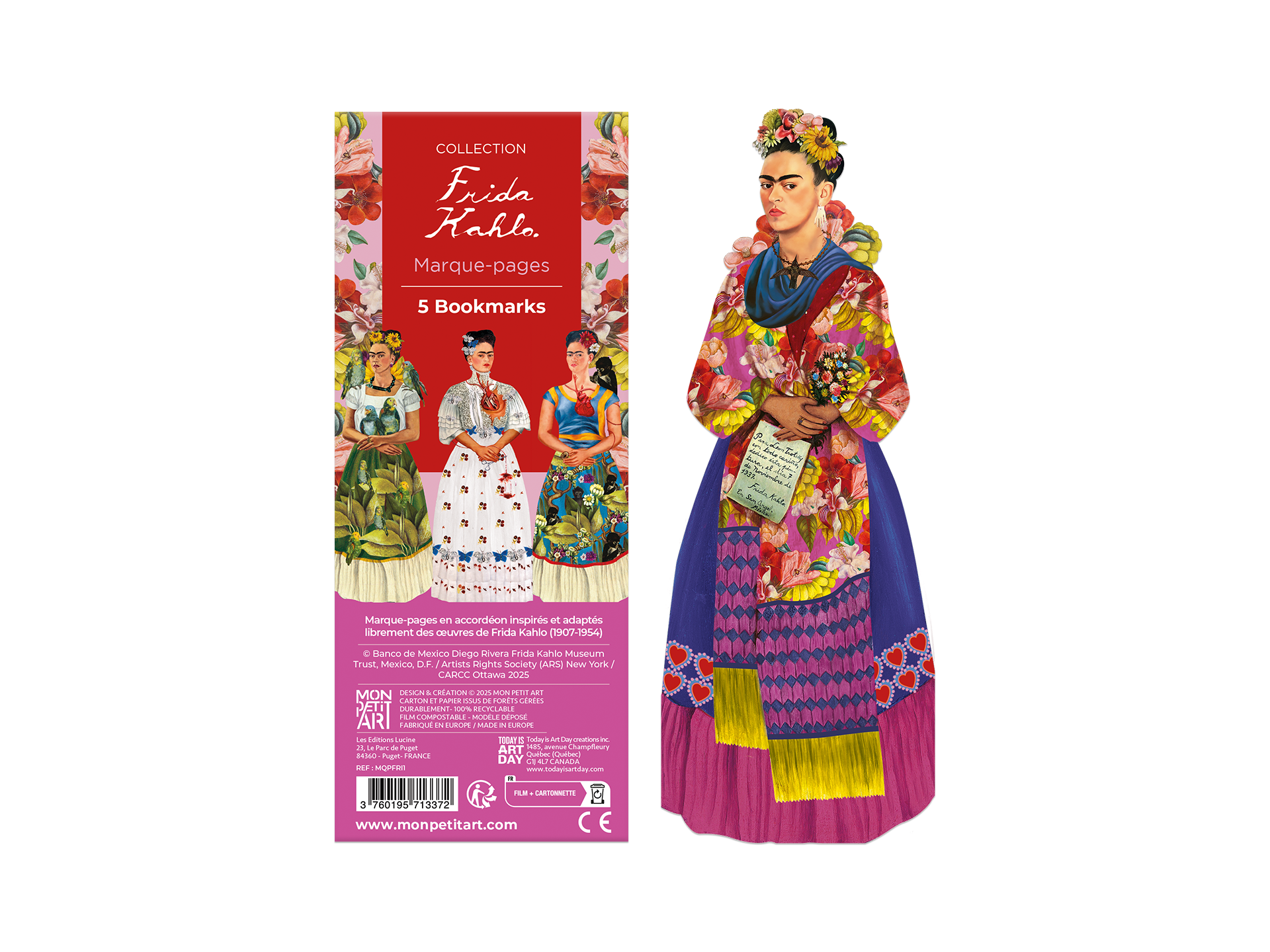 Add some art to your reading! Bookmarks loosely inspired by the works of Frida Kahlo. They can be detached and placed in your books, placed in a row for a pretty decoration, or stuck to the wall as a frieze. Essential and inspiring! Original bookmarks for all lovers of the great artist! - Accordion of 5 detachable bookmarks - Ribambelle: 70x16 cm - Size of each bookmark: 6x16 cm Illustration: Mon Petit Art Material: Paper & Cardboard from sustainably managed forests Manufacturing: create and made in Europe