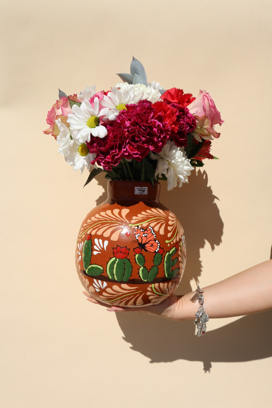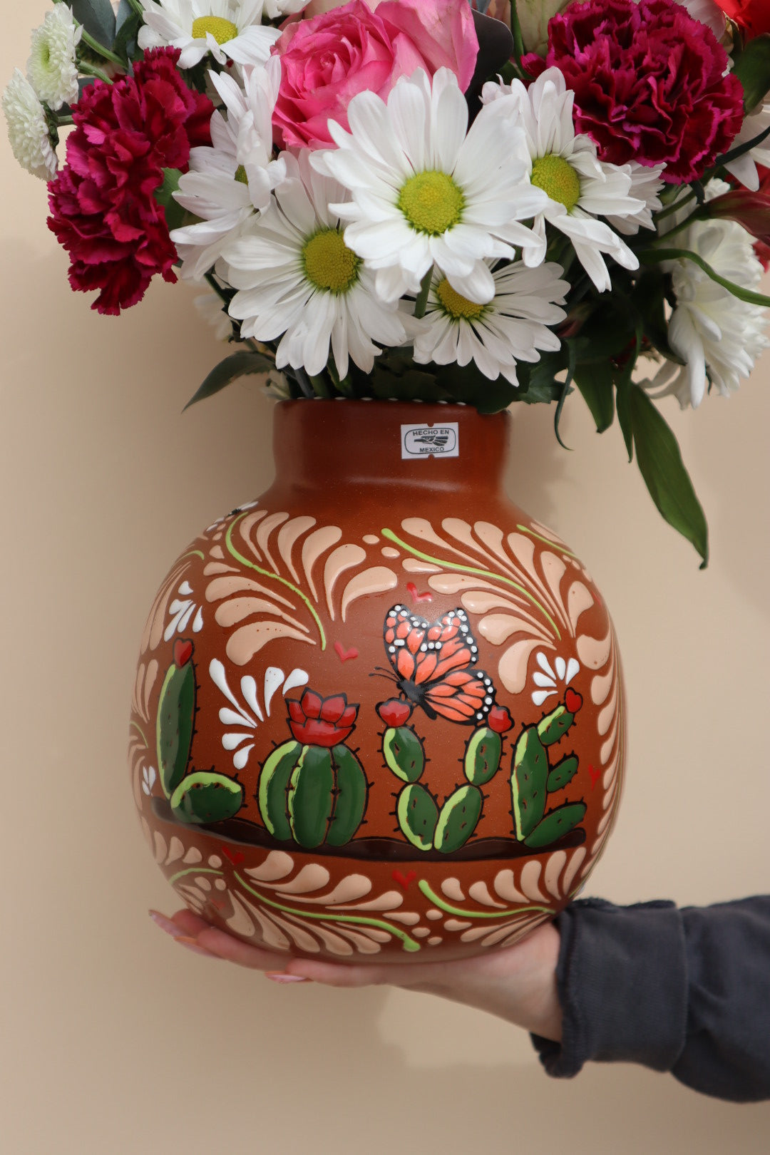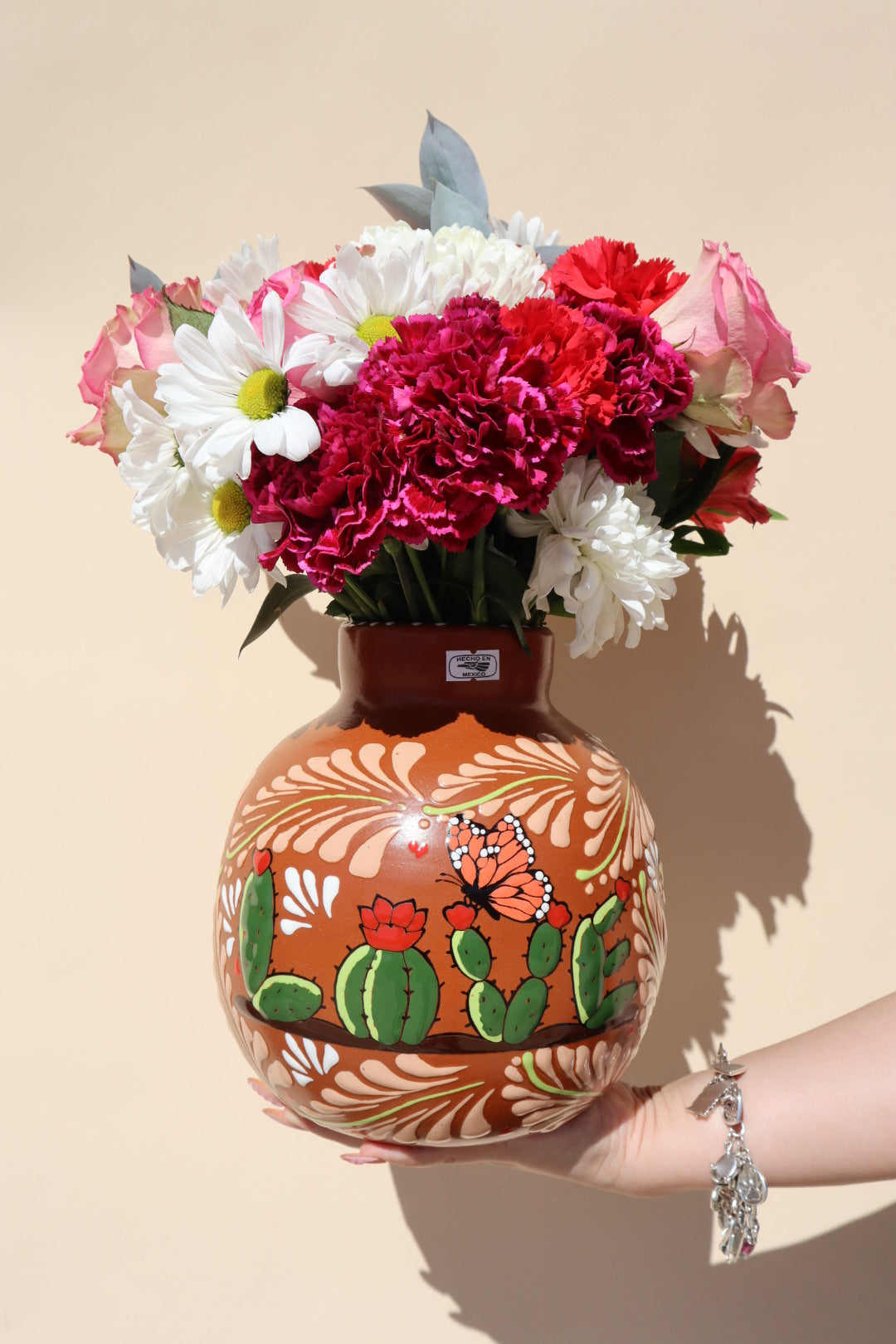 The standout feature of this vessel is the hand-painted cactus garden that creatively spells out the word "LOVE" across the front. Adorned with a delicate Monarch butterfly and vibrant floral accents, each vase is individually painted, ensuring that your piece is a one-of-a-kind work of art with its own unique character and brushstrokes.