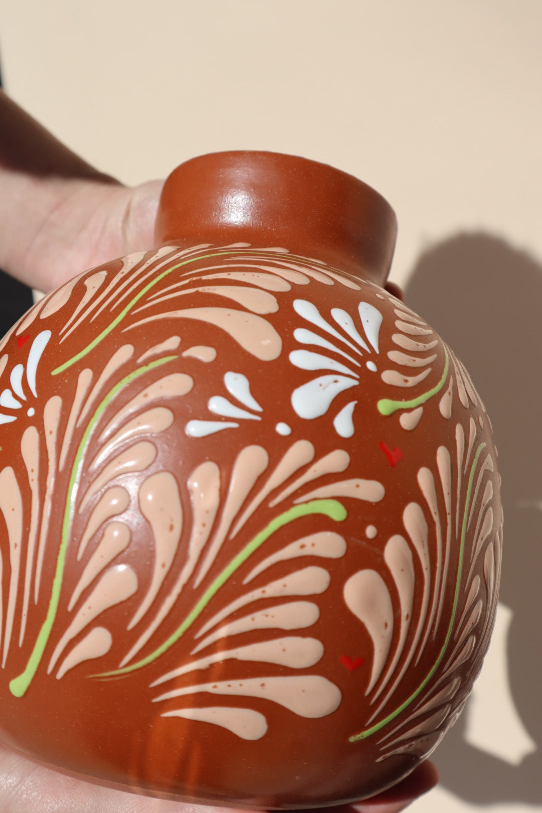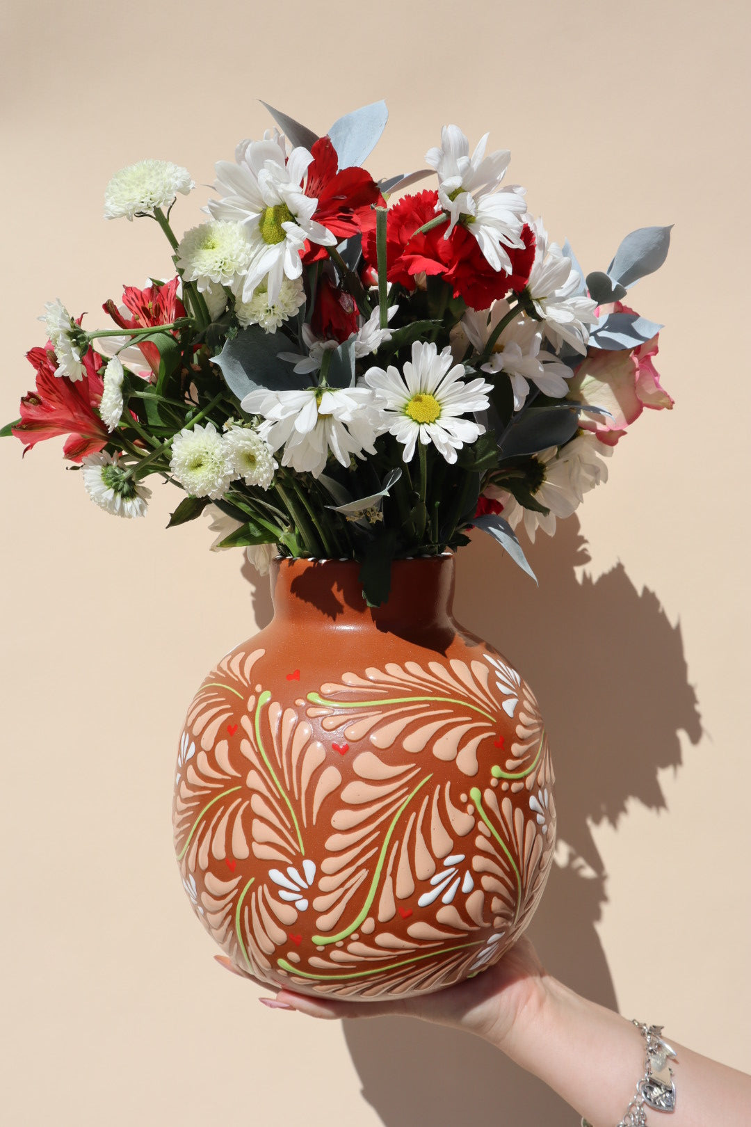 Infuse your home with the rustic charm of the desert with our Cactus Love Vase. This unique piece is a celebration of Mexican tradition, handcrafted by skilled artisans in Guanajuato, Mexico. Made from authentic glazed barro (clay), this vase features a warm, earthy terracotta base that perfectly showcases its playful and romantic design.