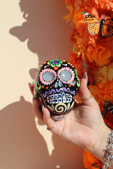 Indulge in the beauty of our handcrafted clay candles. Each candle features the stunning base color BLACK, while the painted colorful designs are a delightful surprise. Our talented artisans hand-paint each candle with a unique combination of colors and patterns, no two are exactly alike.
