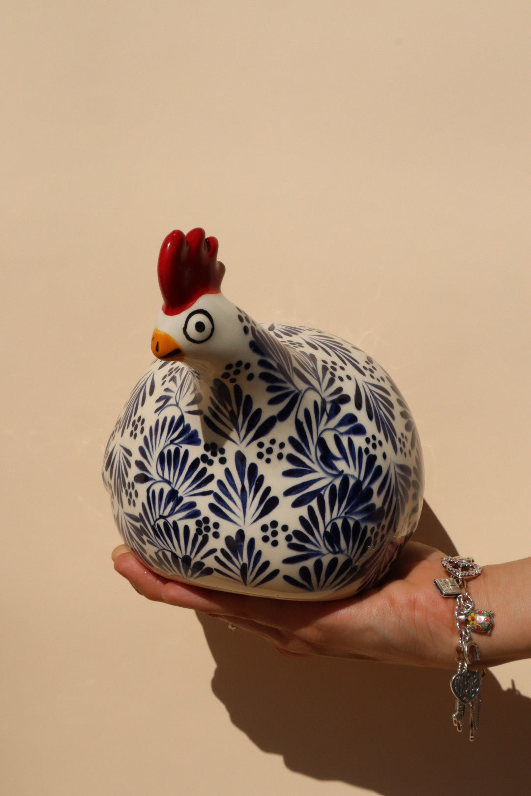 This hen features our warm "Tierra Cálida" colorway—a stunning combination of rich, warm rust and creamy white with intricate floral patterns. Its earthy yet refined presence makes it a truly unique accent for your kitchen, shelf, or centerpiece.