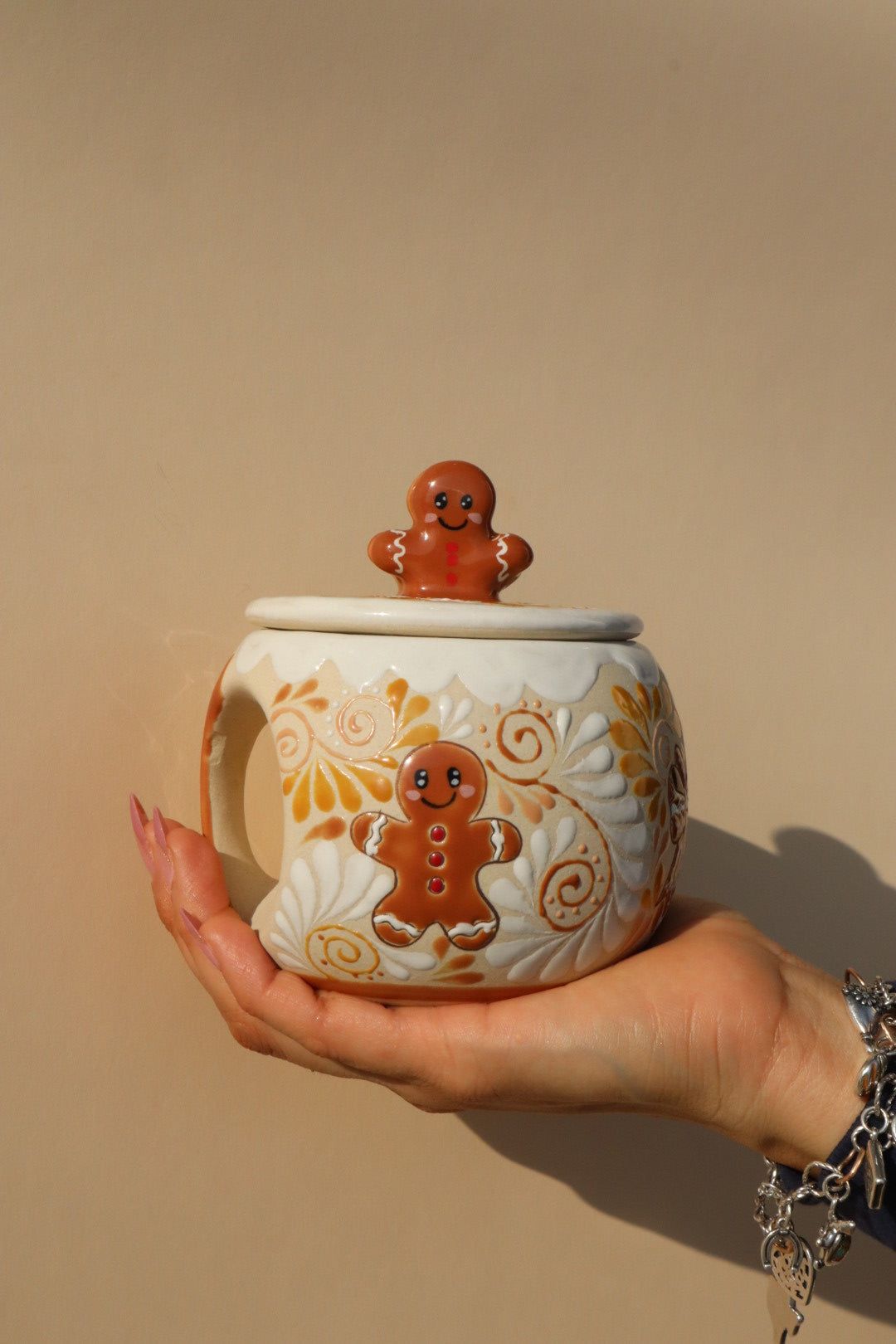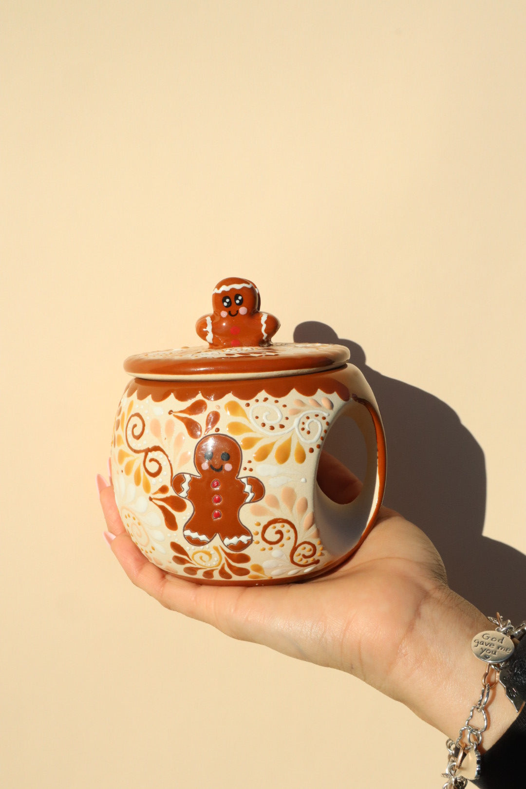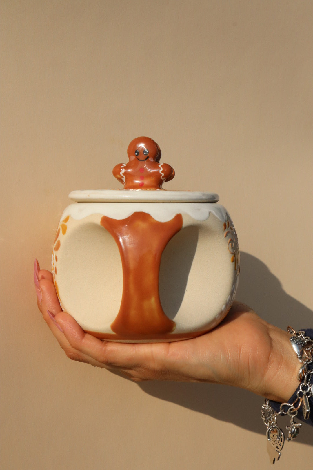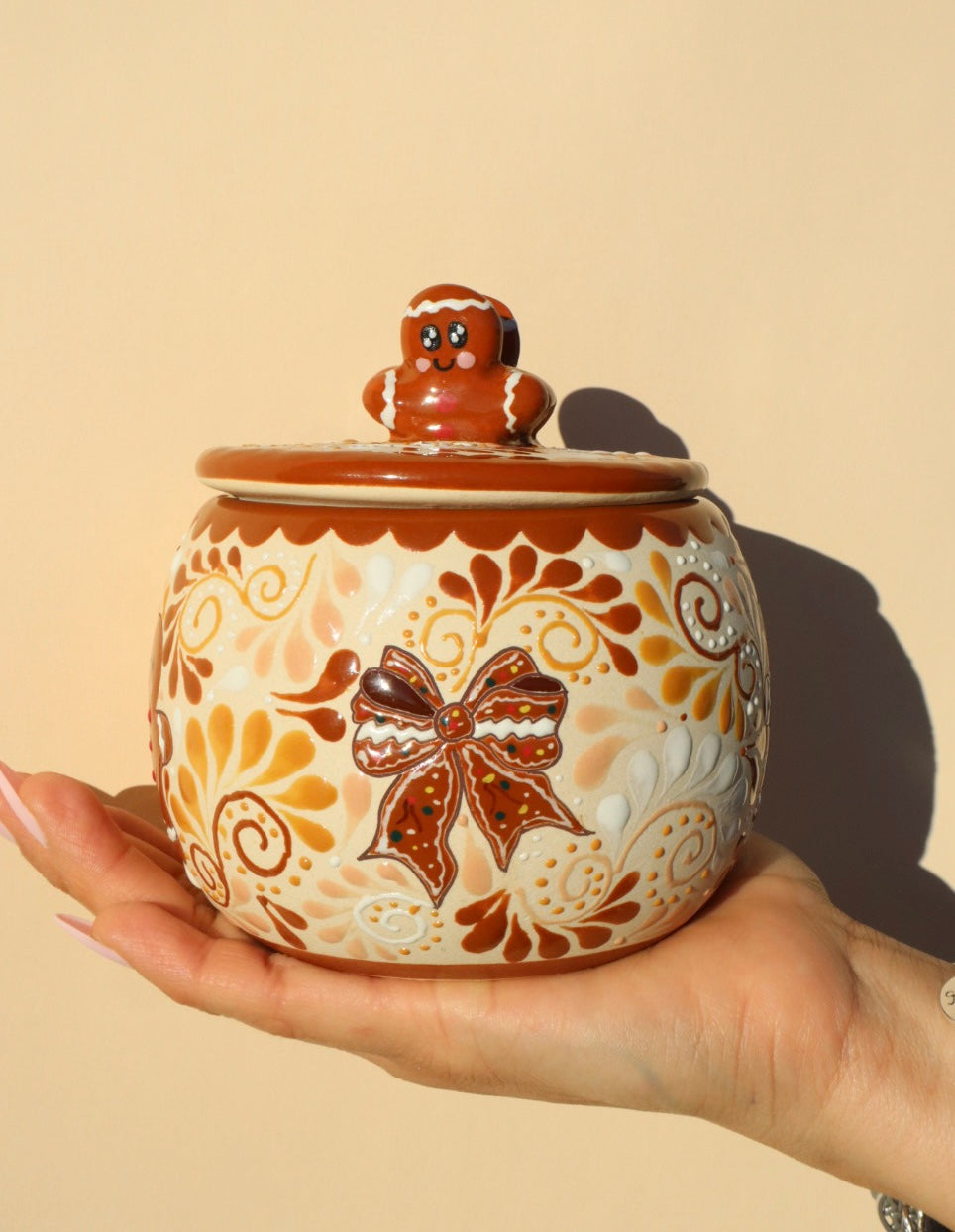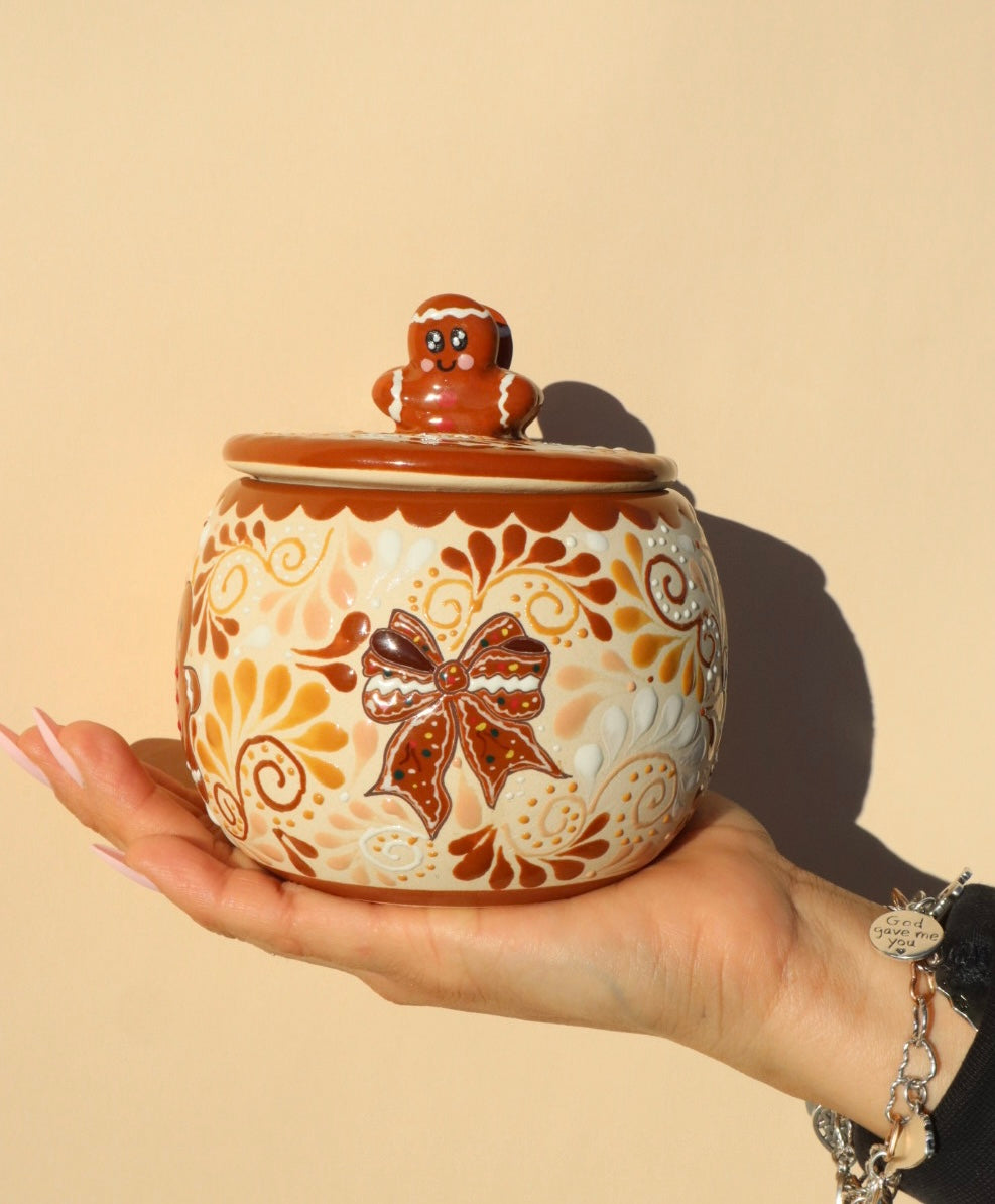 • Handcrafted Detail: The jar features intricate hand-painted details in warm, inviting tones of caramel and cream, creating a beautiful ombré effect with classic holiday swirls and a festive bow motif. The lid is topped with an adorable Gingerbread Man knob—a true collector's detail!