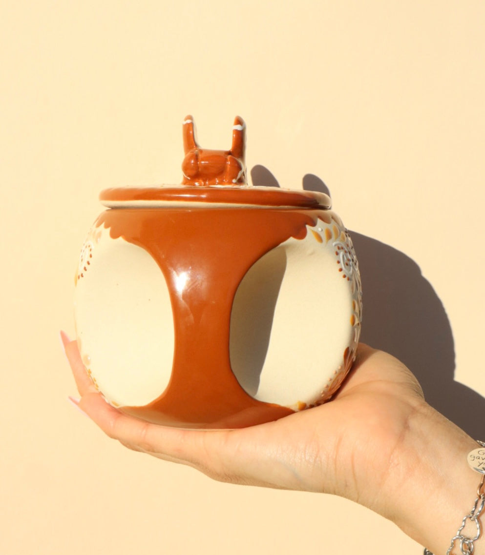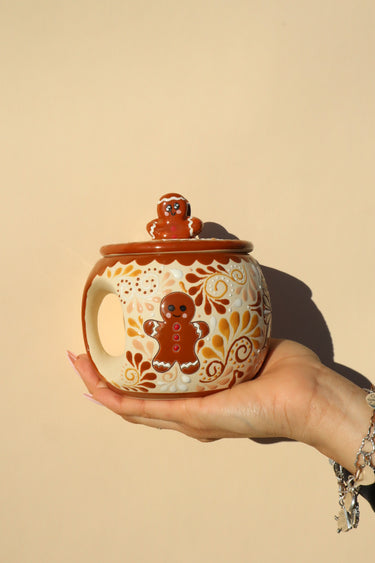 Enter a world of holiday magic with our "Gingerbread in Wonderland" Candle! This delightful piece is housed in a unique, lidded ceramic vessel, handcrafted by skilled artisans in the Estado de México. It is an exclusive design for Luz y Tierra, adapted from the traditional Taza Búho mug form.