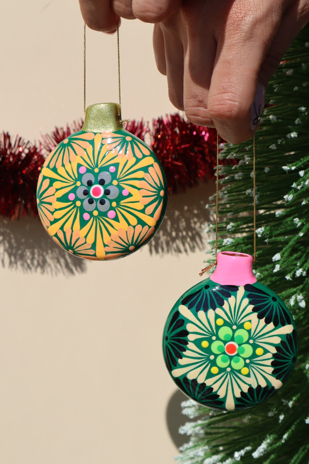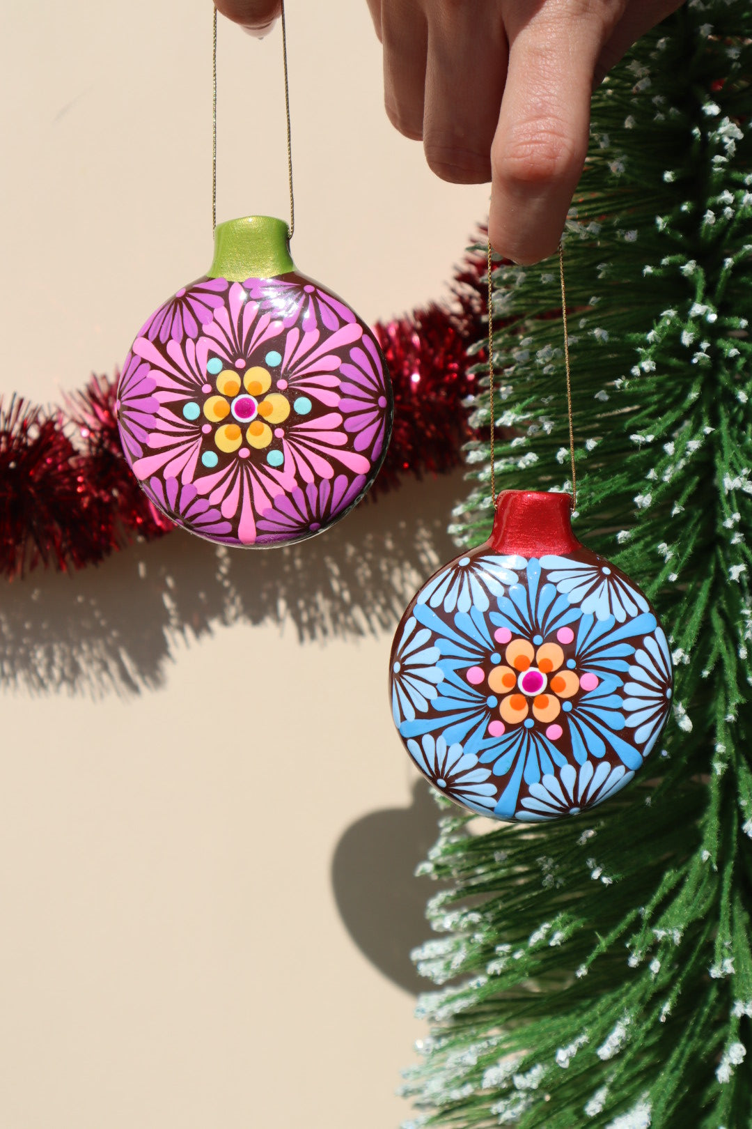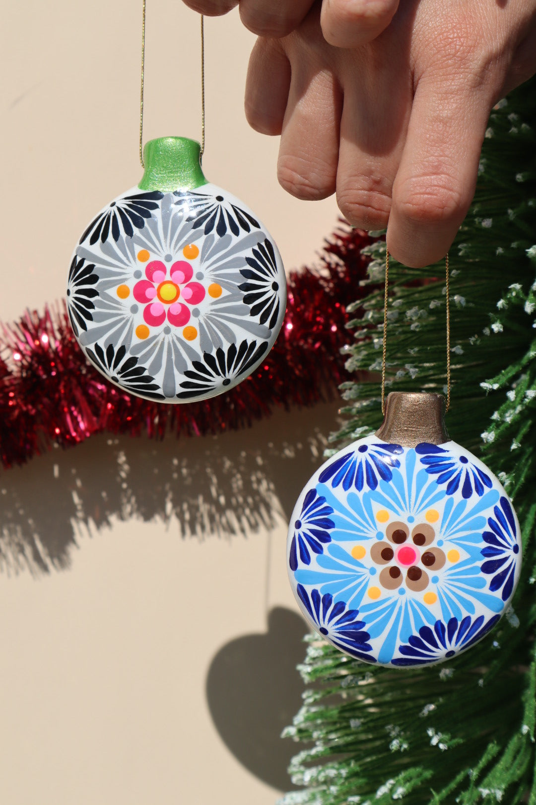 The hand-painted geometric floral pattern is reminiscent of traditional Mexican Talavera and folk art designs, though rendered in a style unique to the Guerrero region. Since every piece is hand-painted in a freestyle manner, no two ornaments are exactly alike; the color combinations and slight variations in the pattern make yours truly one-of-a-kind.