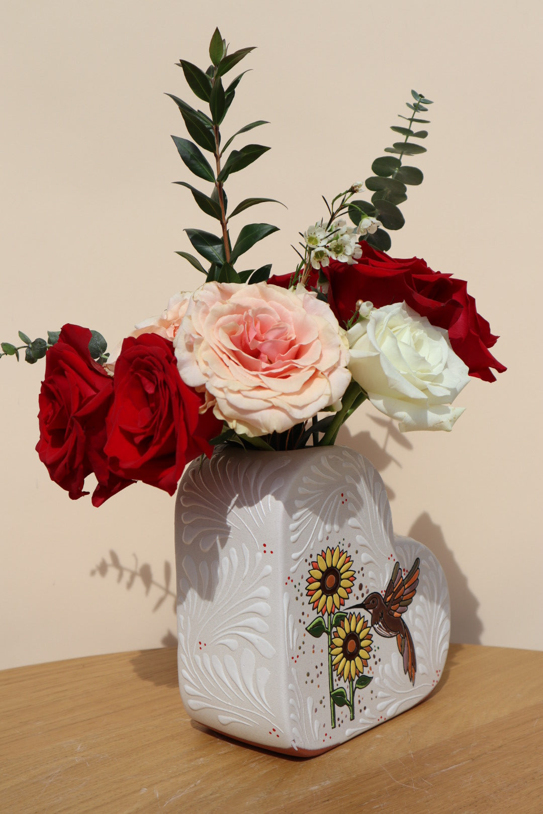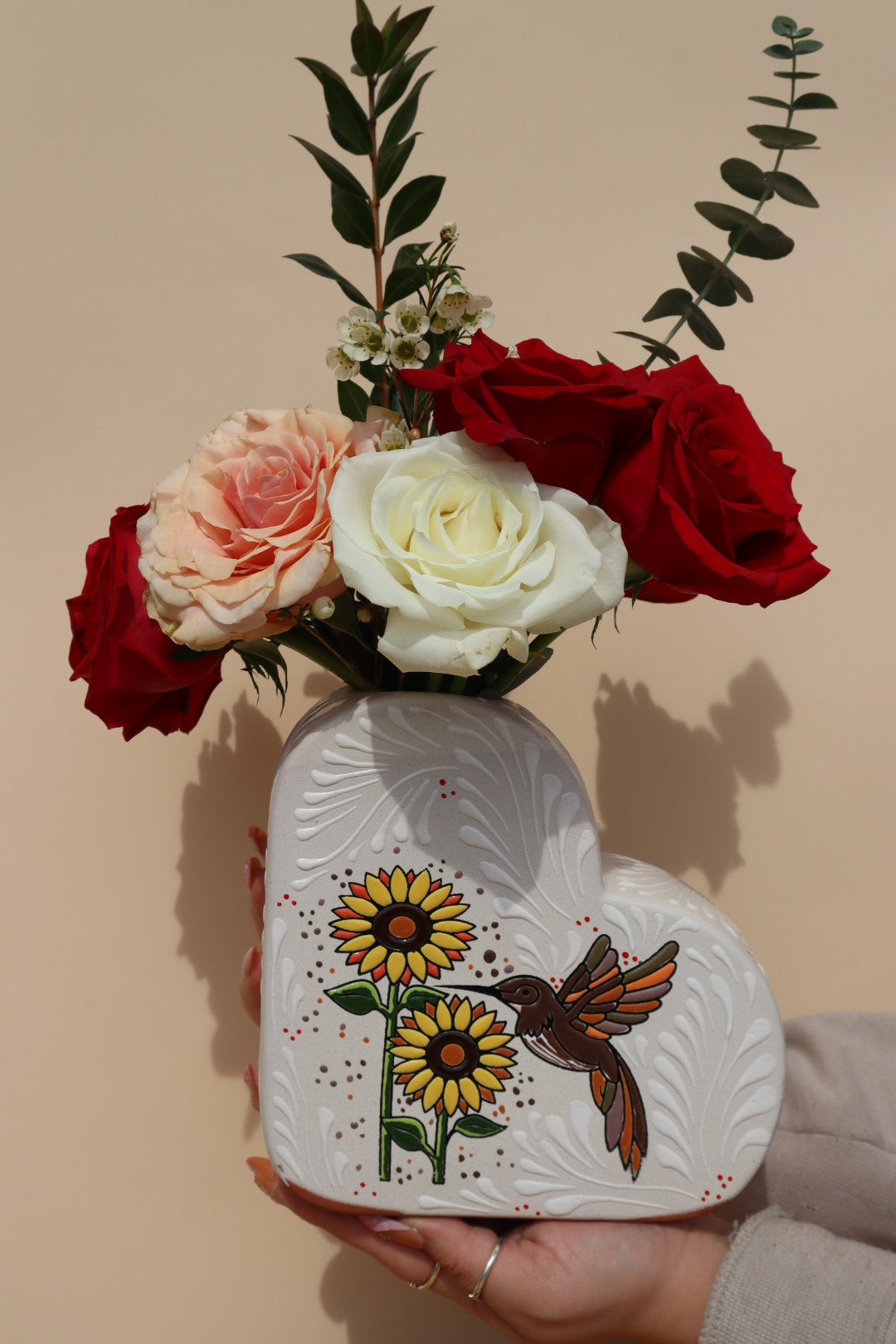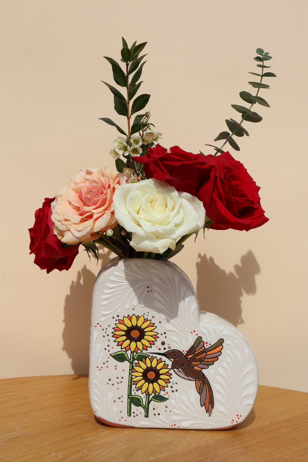 Capture the delicate beauty of nature with the Corazón Vase (Colibrí) (hummingbird). This heart-shaped vessel is a stunning tribute to Mexican craftsmanship, handcrafted by skilled artisans in Guanajuato, Mexico. This piece features the Colibrí(hummingbird), a symbol of joy, healing, and good luck, flitting among vibrant, hand-painted floral patterns.