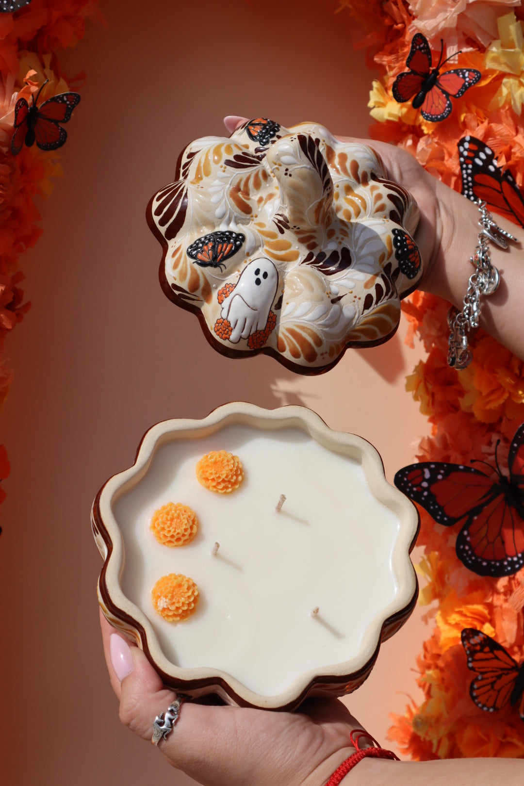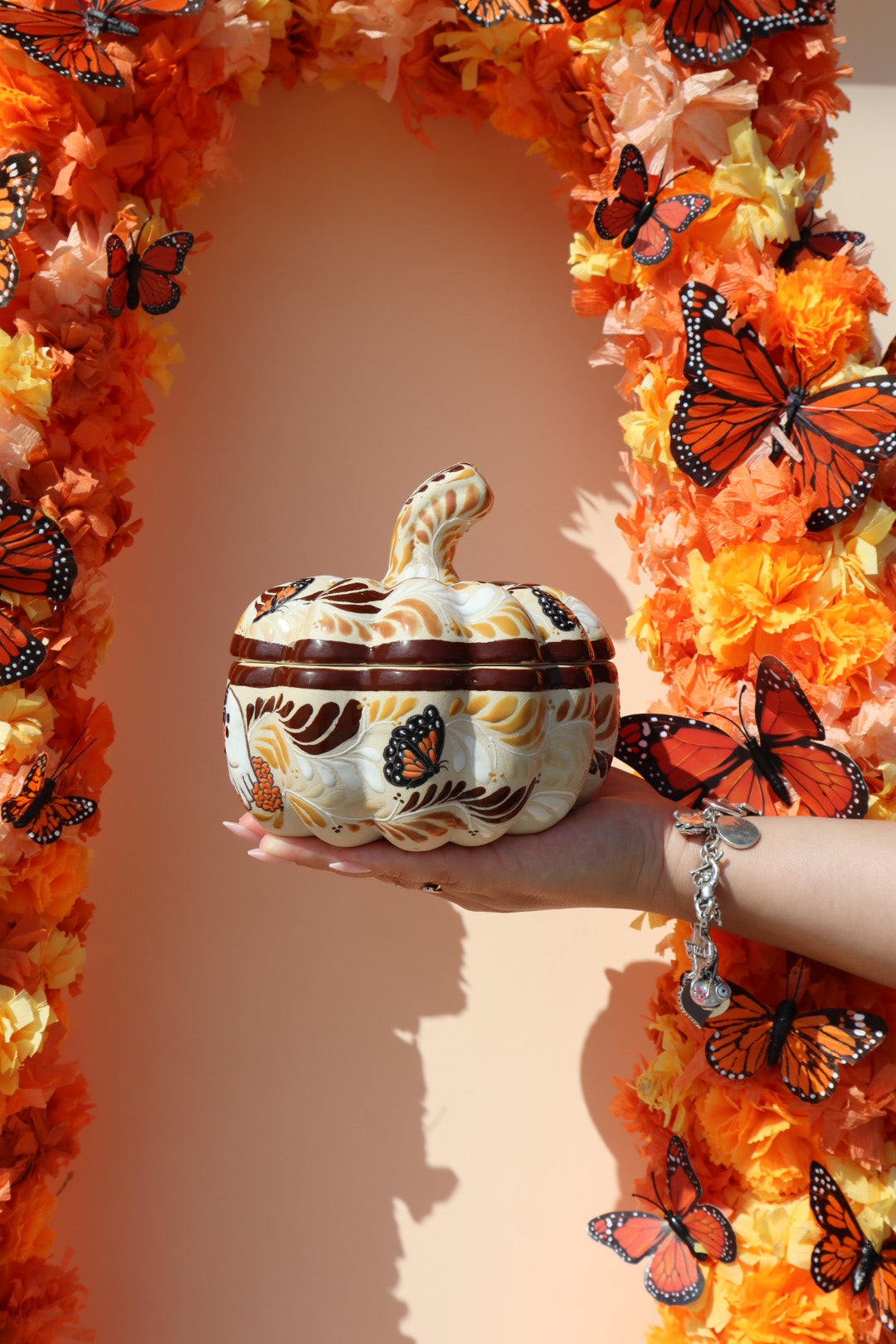 Celebrate the magic of the season and the beauty of Mexican artistry with our exquisite "Mariposa de Otoño" Calabaza Candle. This stunning ceramic pumpkin vessel is an exclusive design, handcrafted with exceptional detail in Estado de México just for us. Adorned with delicate monarch butterflies – symbols of migration and transformation – and intricate autumnal patterns in rich, warm hues, it beautifully captures the essence of fall and the spirit of Mexico.