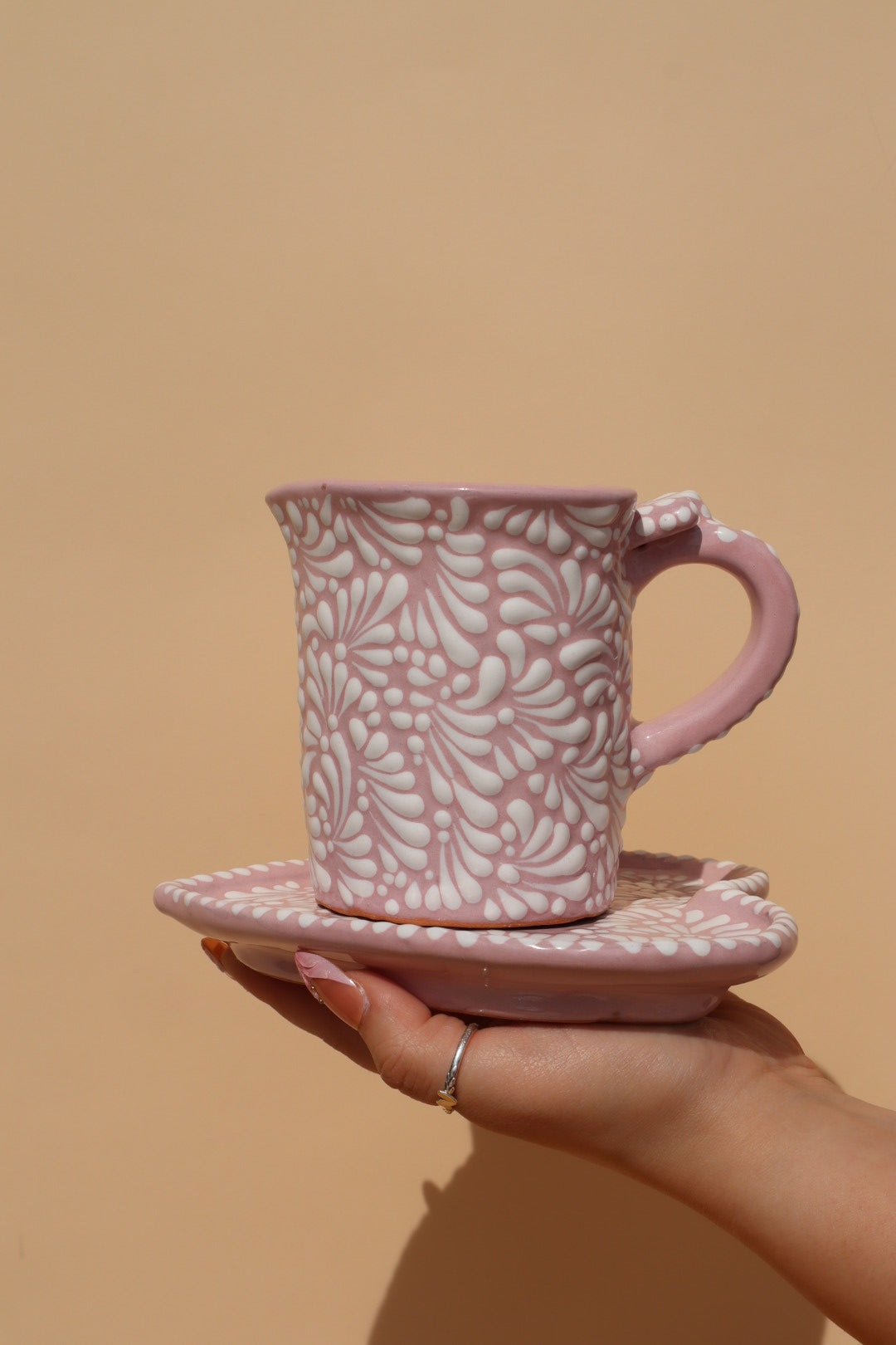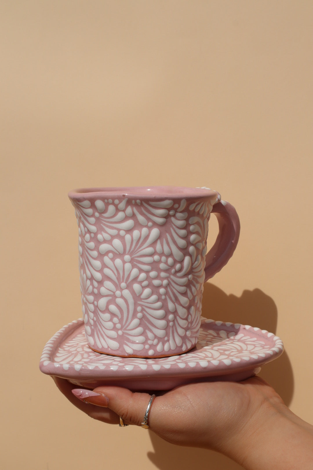 Bring a taller, more elegant silhouette to your coffee ritual with this version of the Rosita Romantic set. Handcrafted in Puebla, Mexico, each mug is meticulously shaped on a pottery wheel, ensuring an organic, artisanal quality that only hand-thrown ceramics can offer.