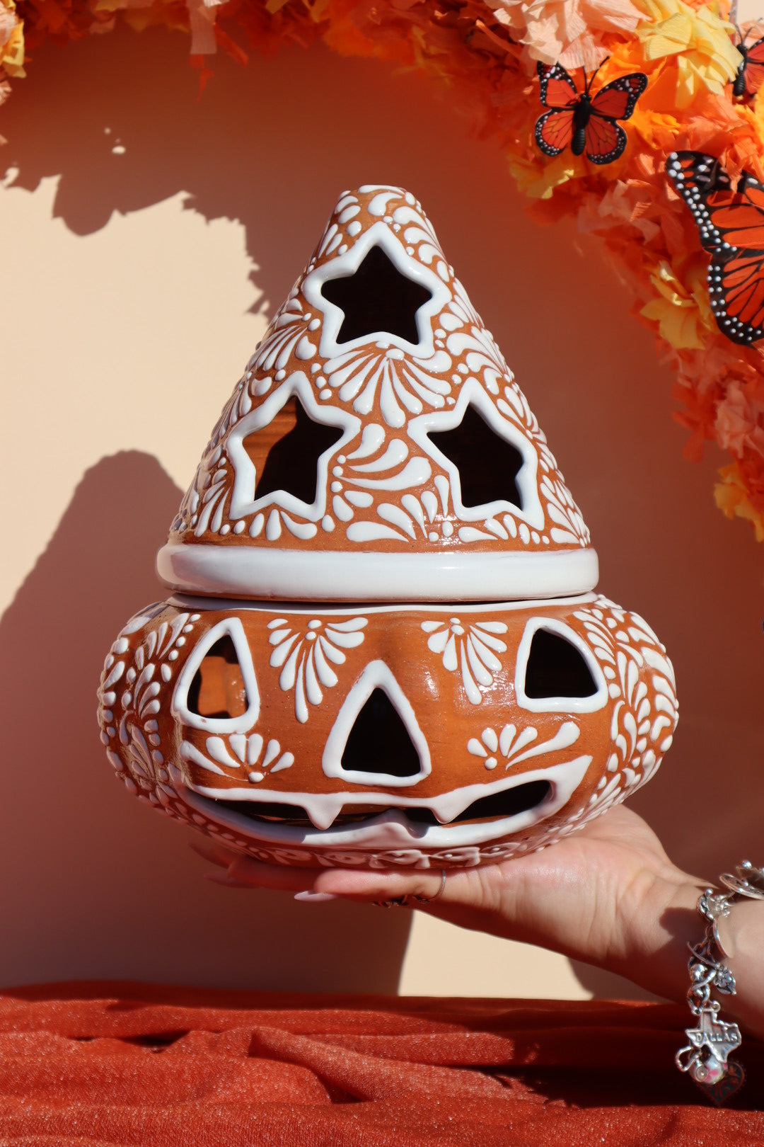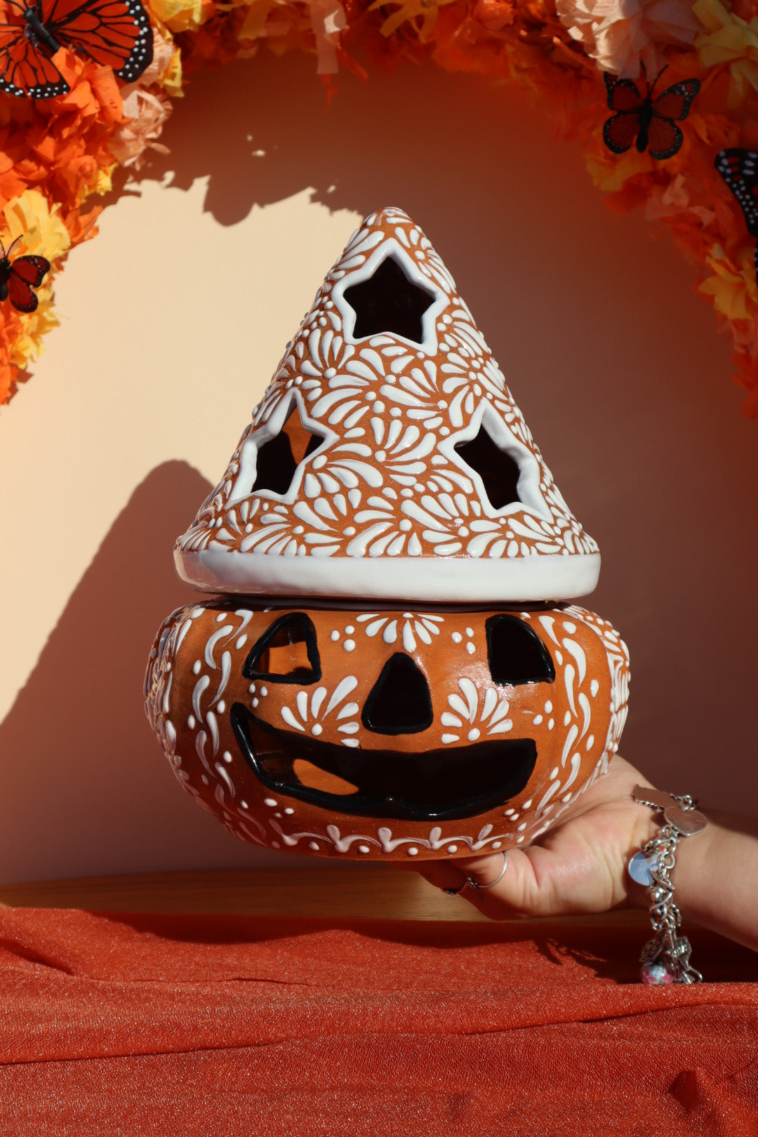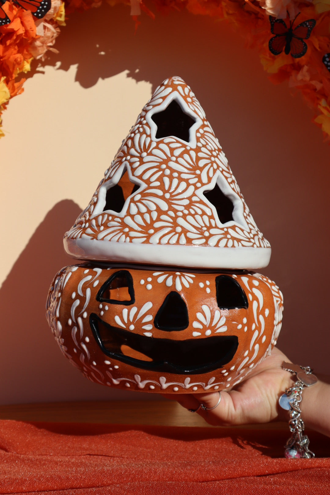 Handcrafted in Puebla exclusively for Luz y Tierra, we collaborated with master artisans to select the beautiful orange glaze and classic white floral patterns to create a unique piece that celebrates Halloween in an authentic Mexican style. The pumpkin features traditional carved jack-o'-lantern eyes and a smiling mouth, beautifully offset by the intricate Talavera floral designs painted around the body.